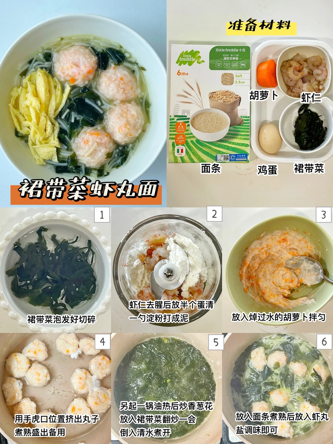 🔹食材:裙带菜、虾仁、胡萝卜、鸡蛋、小皮面条