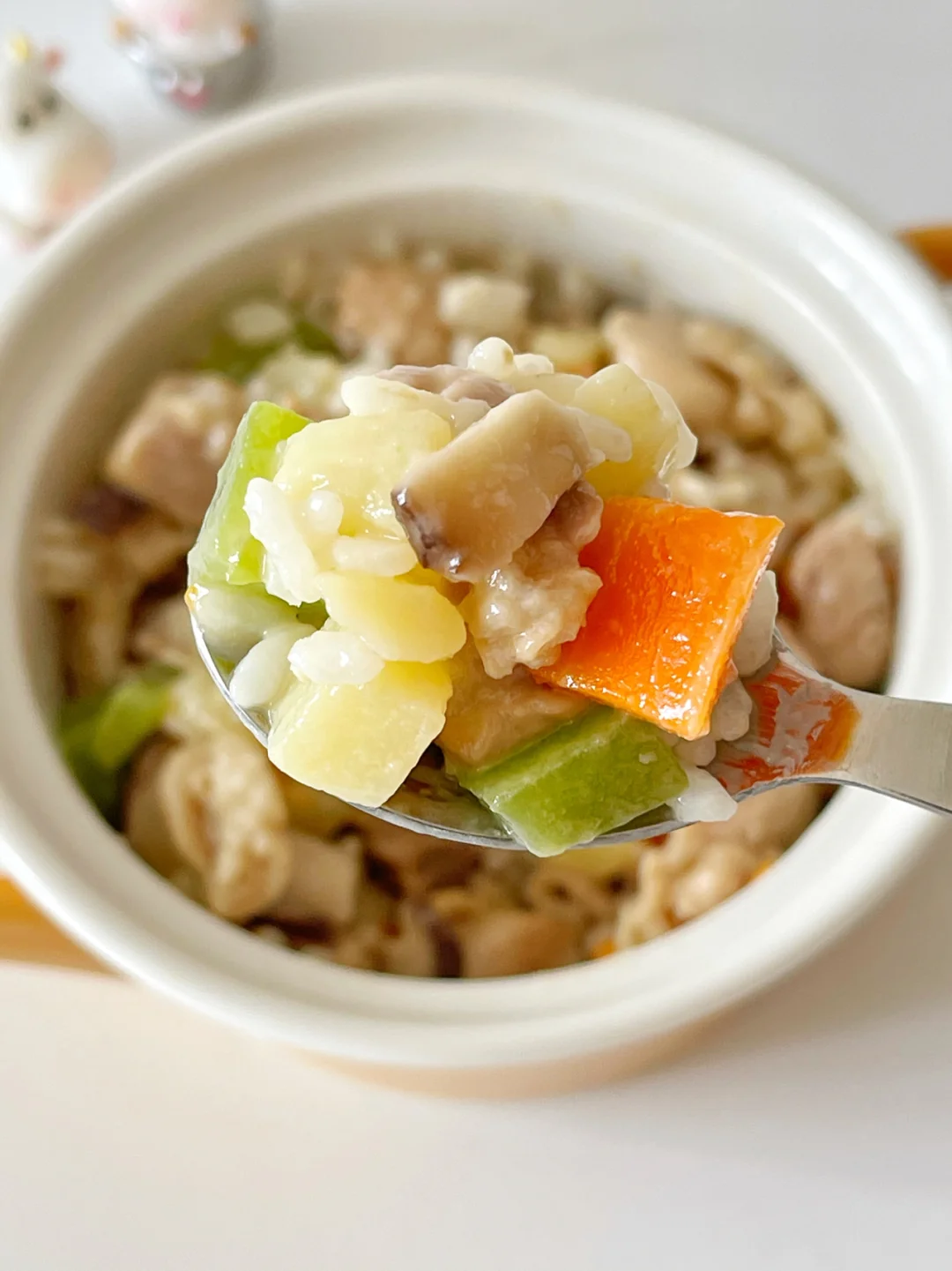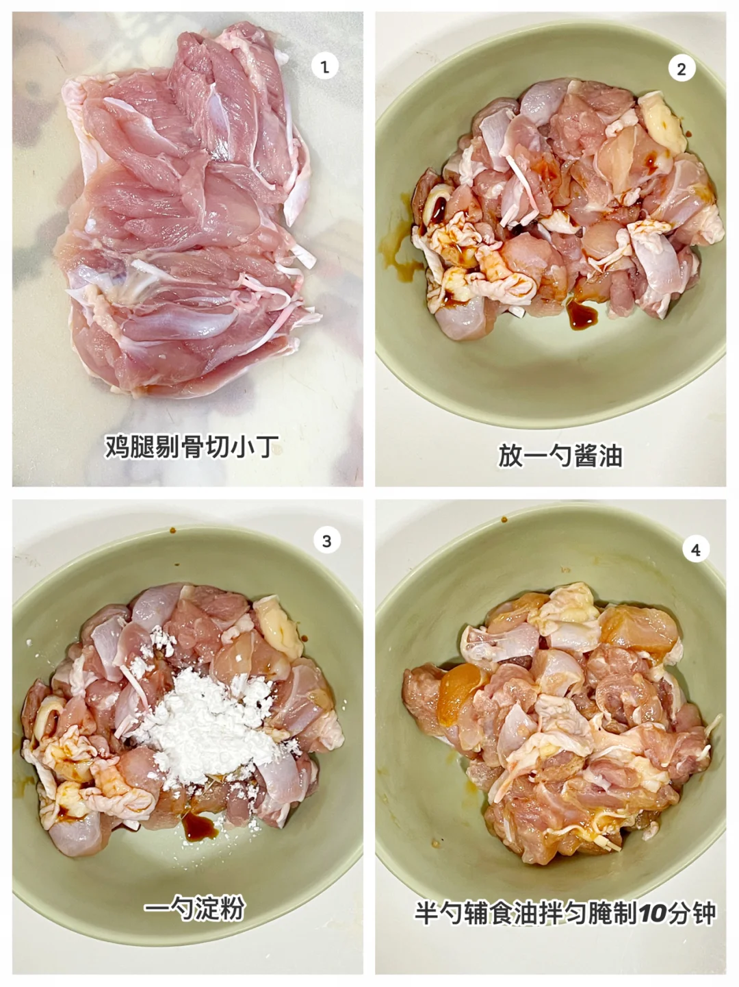 🔹米提前煮成米饭。鸡腿剔骨切小丁,放一勺酱油、一勺淀粉、半勺辅食油拌匀腌制10分钟。
