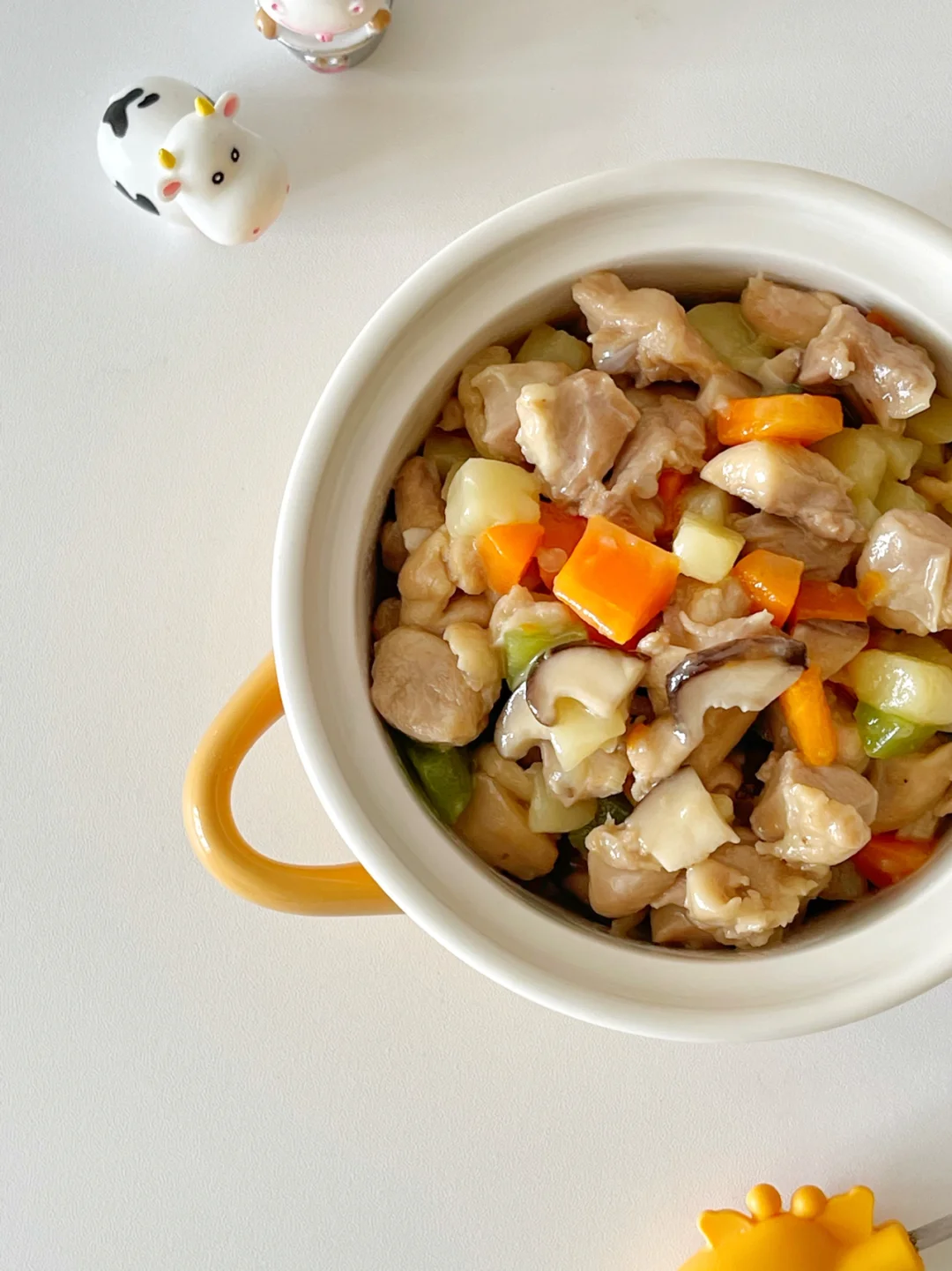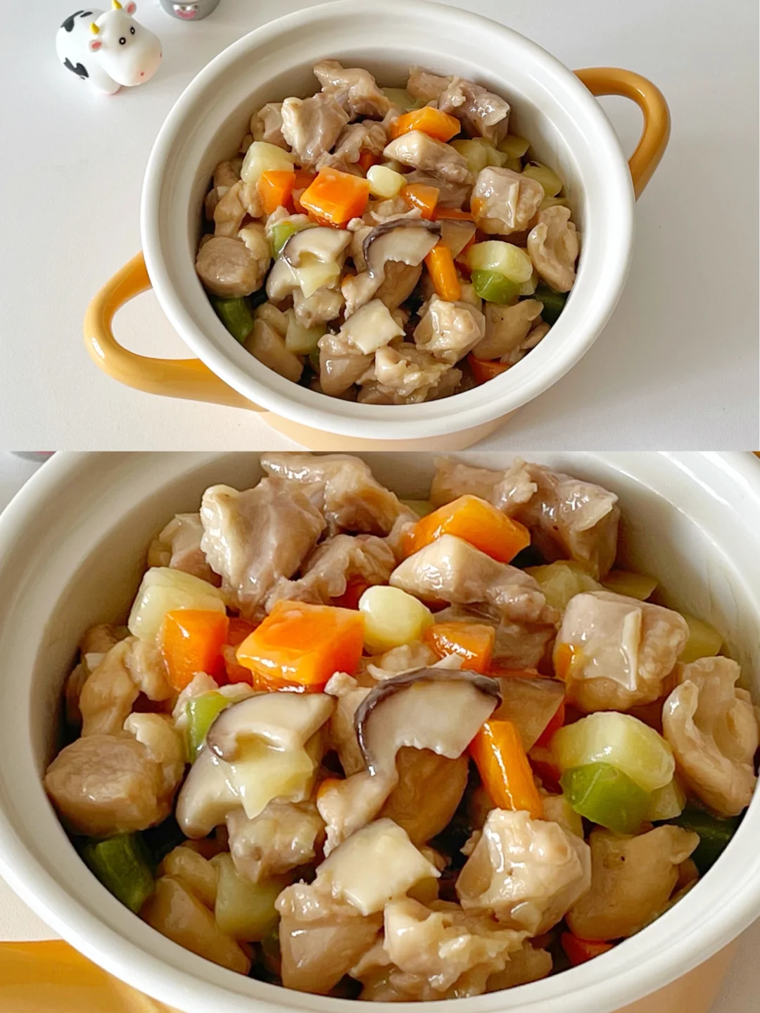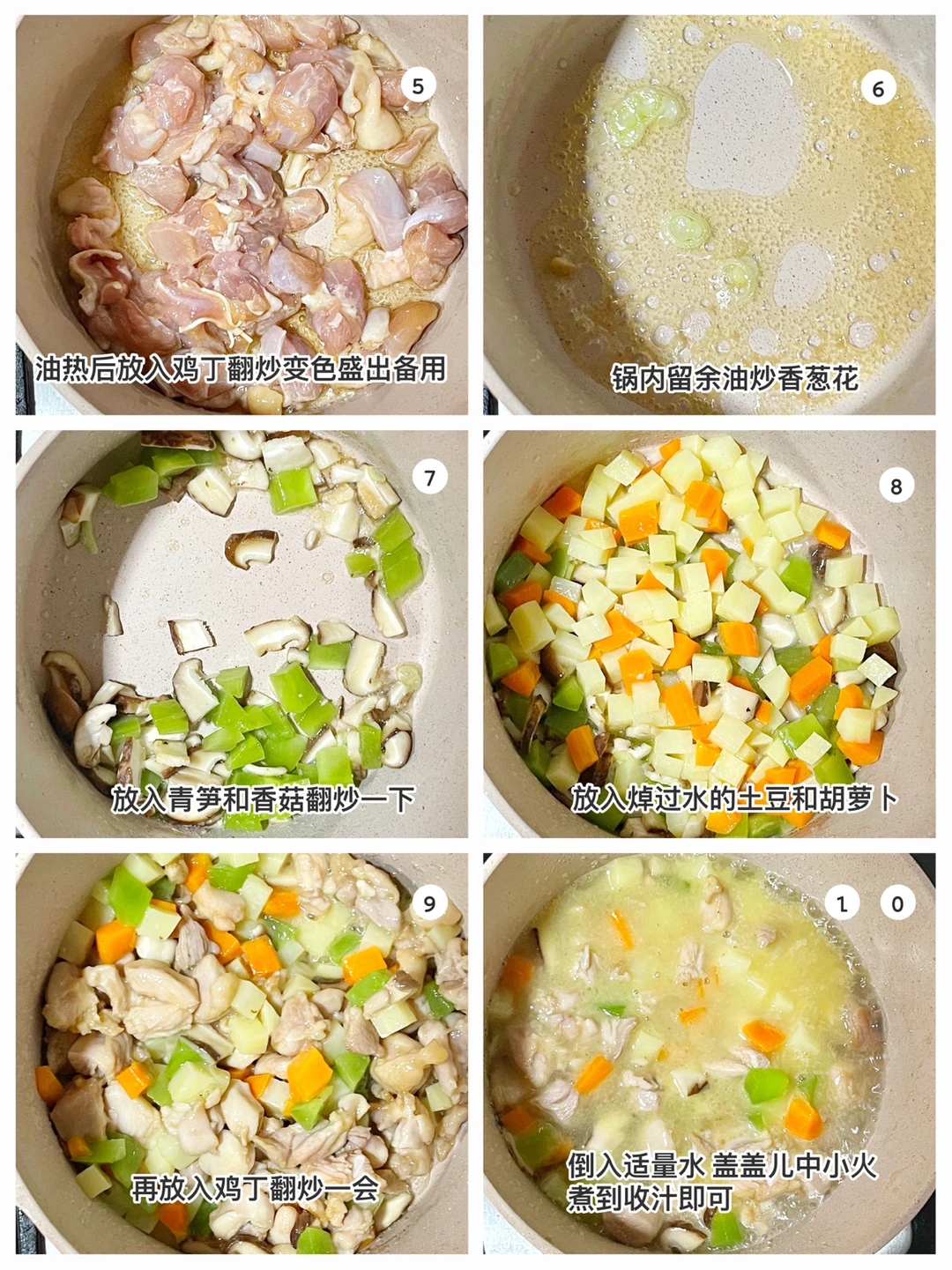 🔹锅中油热后,放入腌制好的鸡肉丁,翻炒变色盛出备用。留余油炒香葱花,放入香菇丁和青笋丁翻炒一下,再放入土豆和胡萝卜,放入鸡肉丁翻炒一会儿,倒入适量的水,煮开转中小火盖锅盖炖煮,煮到收汁出锅.