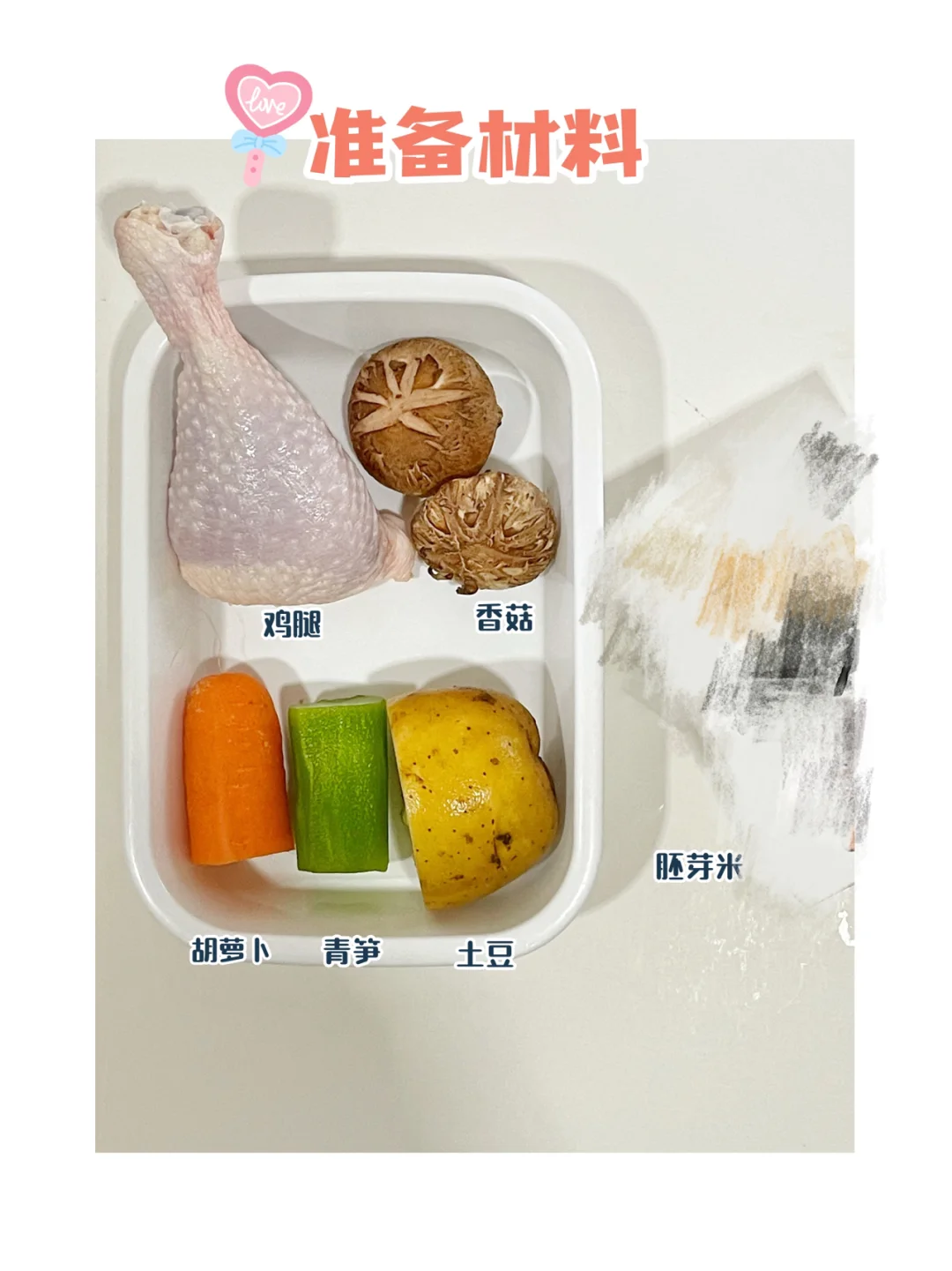 ✅准备材料:鸡腿、香菇、土豆、胡萝卜、青笋、胚芽米。