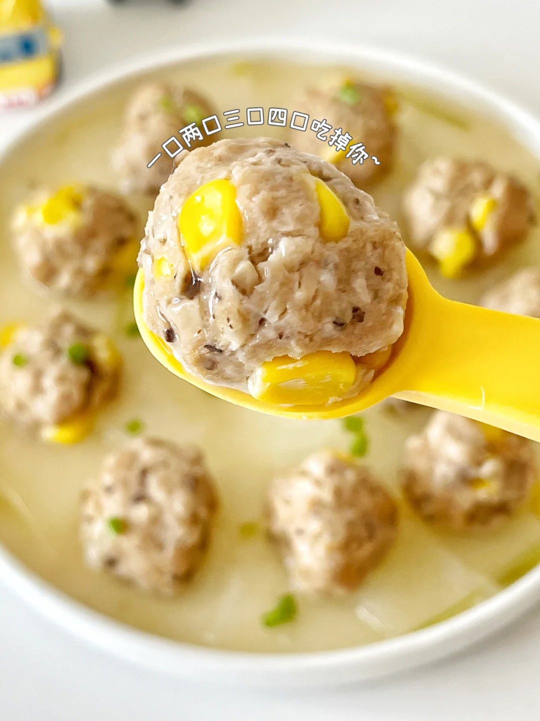 🔹猪里脊姜片去腥后,切小块放料理杯打成肉泥,放入香菇碎和玉米粒,倒入一点宝宝酱油,一勺淀粉拌匀,最后滴入几滴核桃油拌匀.