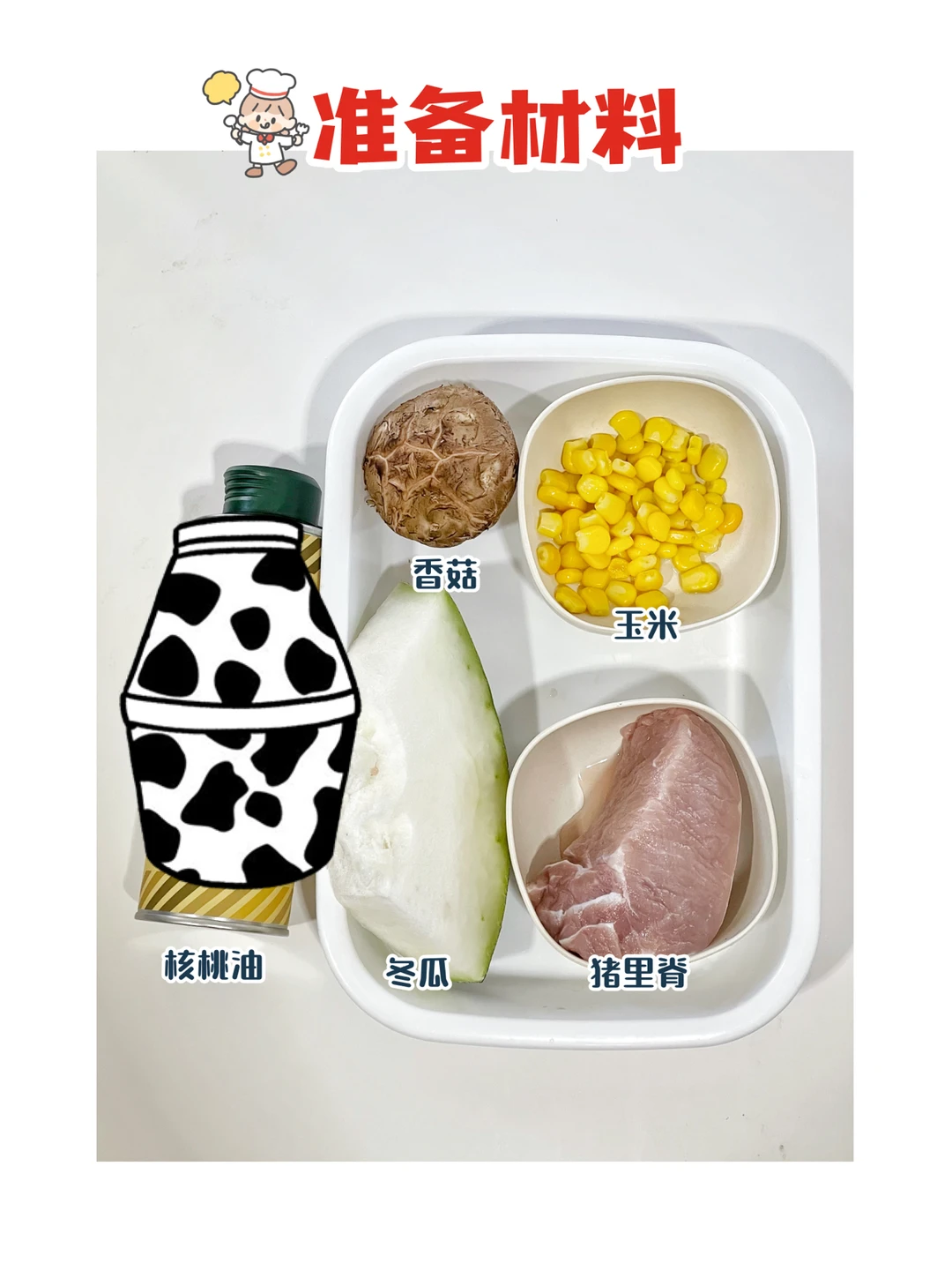✅准备材料:冬瓜、猪肉、香菇、玉米、核桃油。