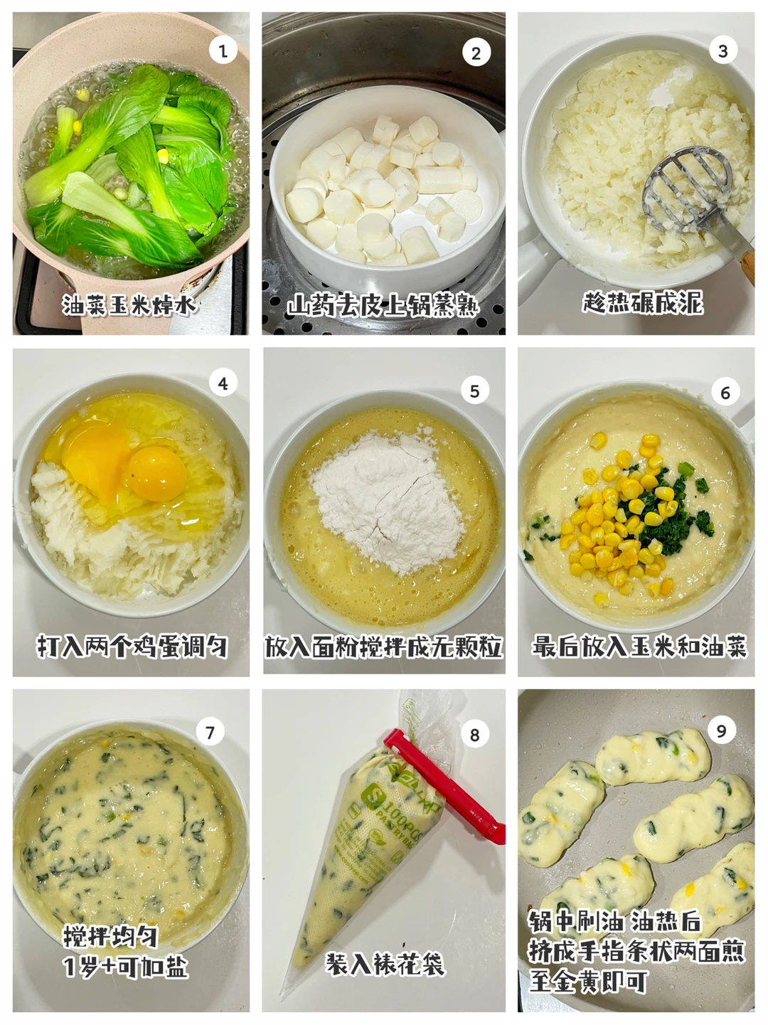 🔹油菜和玉米粒焯水(油菜切碎末),山药去皮上锅蒸熟,趁热碾成泥打入鸡蛋搅匀,再筛入面粉搅拌无颗粒状,最后放入玉米粒和油菜碎拌匀装入裱花袋.