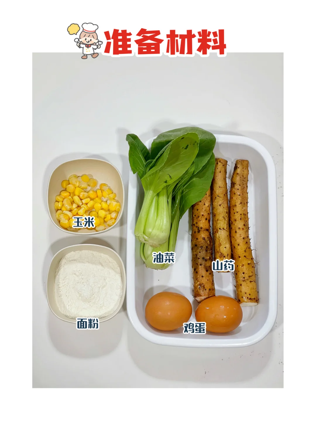 ✅准备材料:山药120克、面粉60克、玉米粒、油菜、鸡蛋2个。