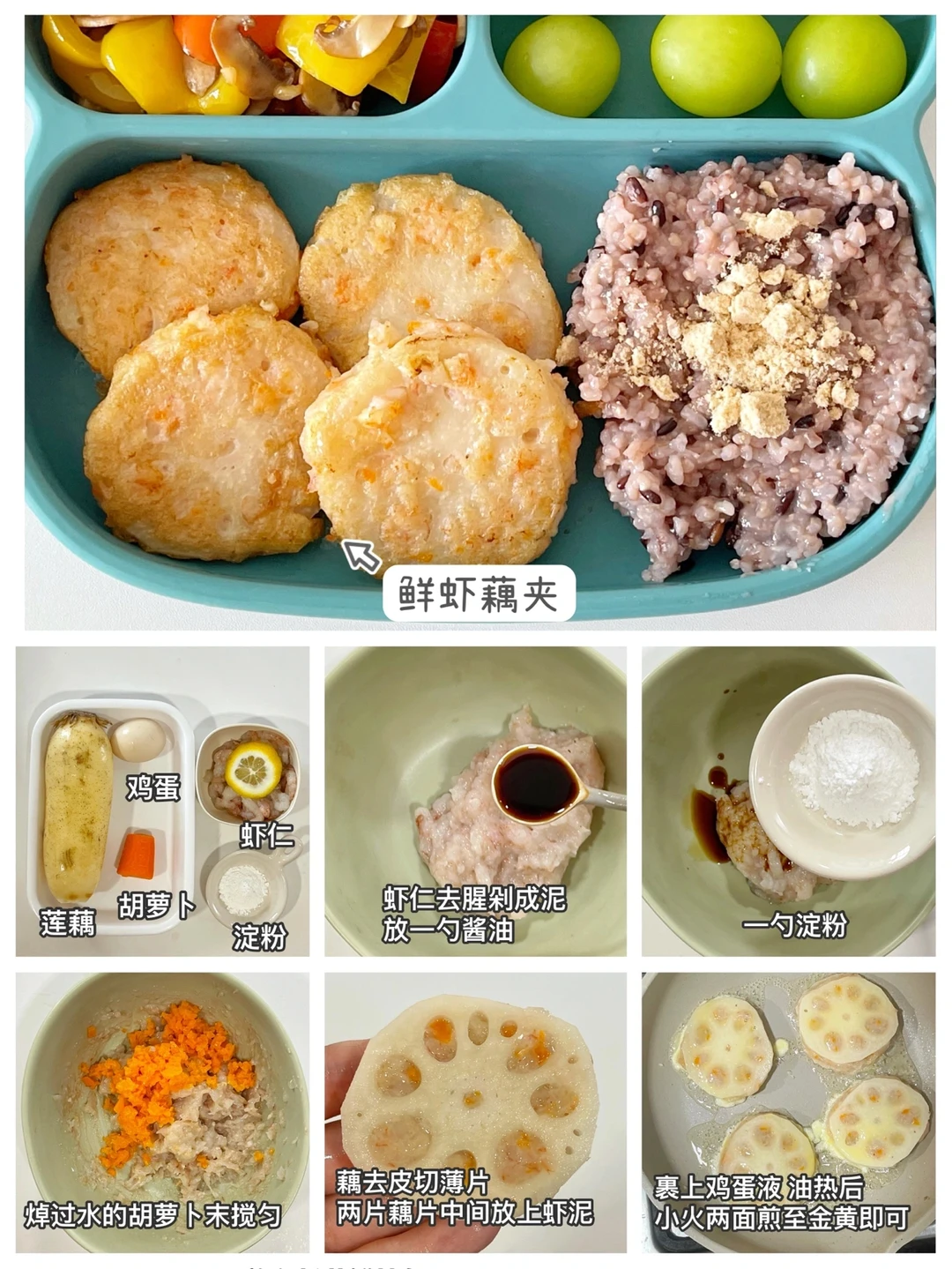 食材:虾仁、莲藕、胡萝卜、鸡蛋、淀粉。