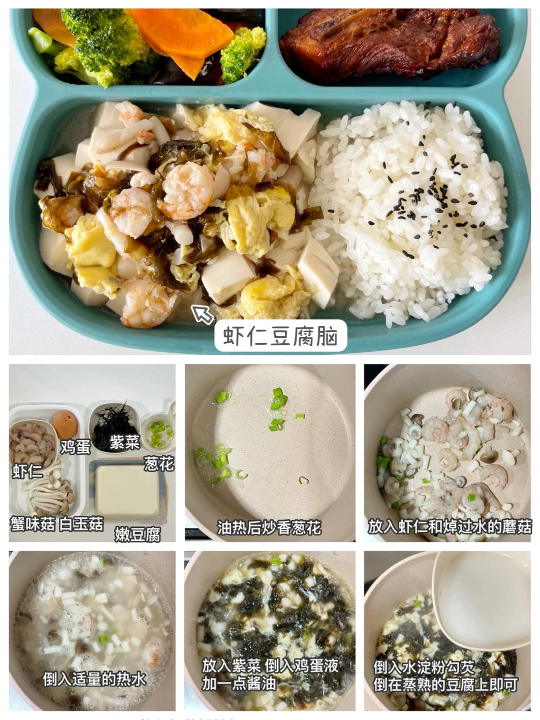 ✅周二:虾仁豆腐脑、西兰花胡萝卜小炒、红烧排骨、米饭