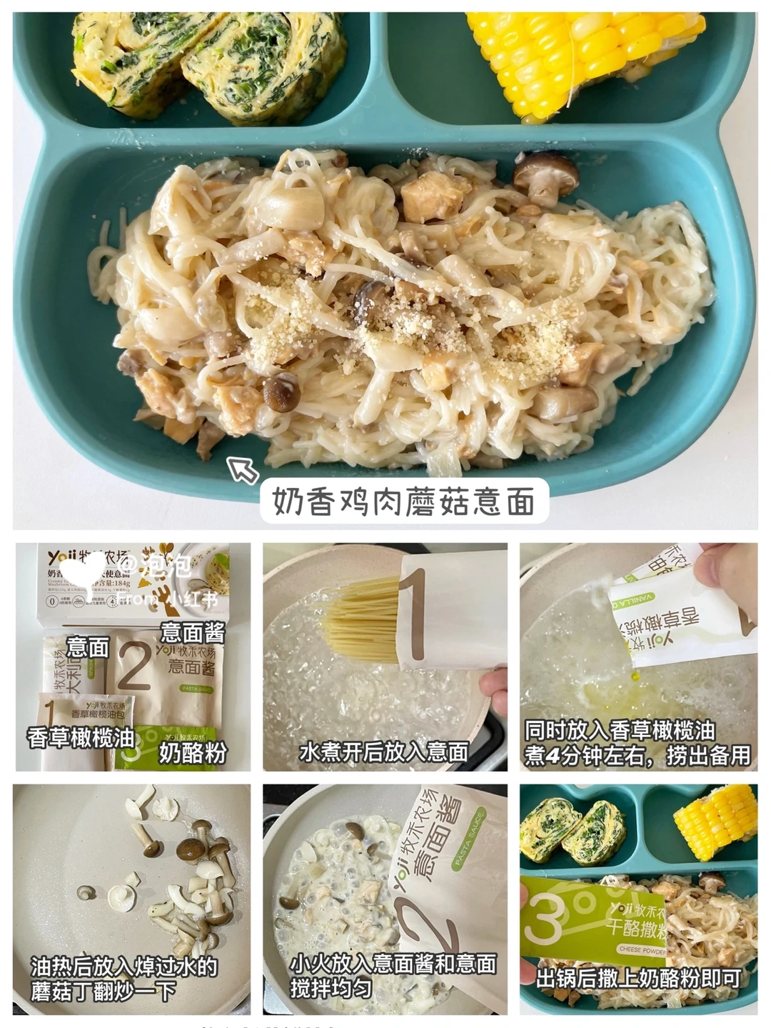 ✅周三:奶香鸡肉蘑菇意面、菠菜厚蛋烧、鹌鹑蛋、煮玉米