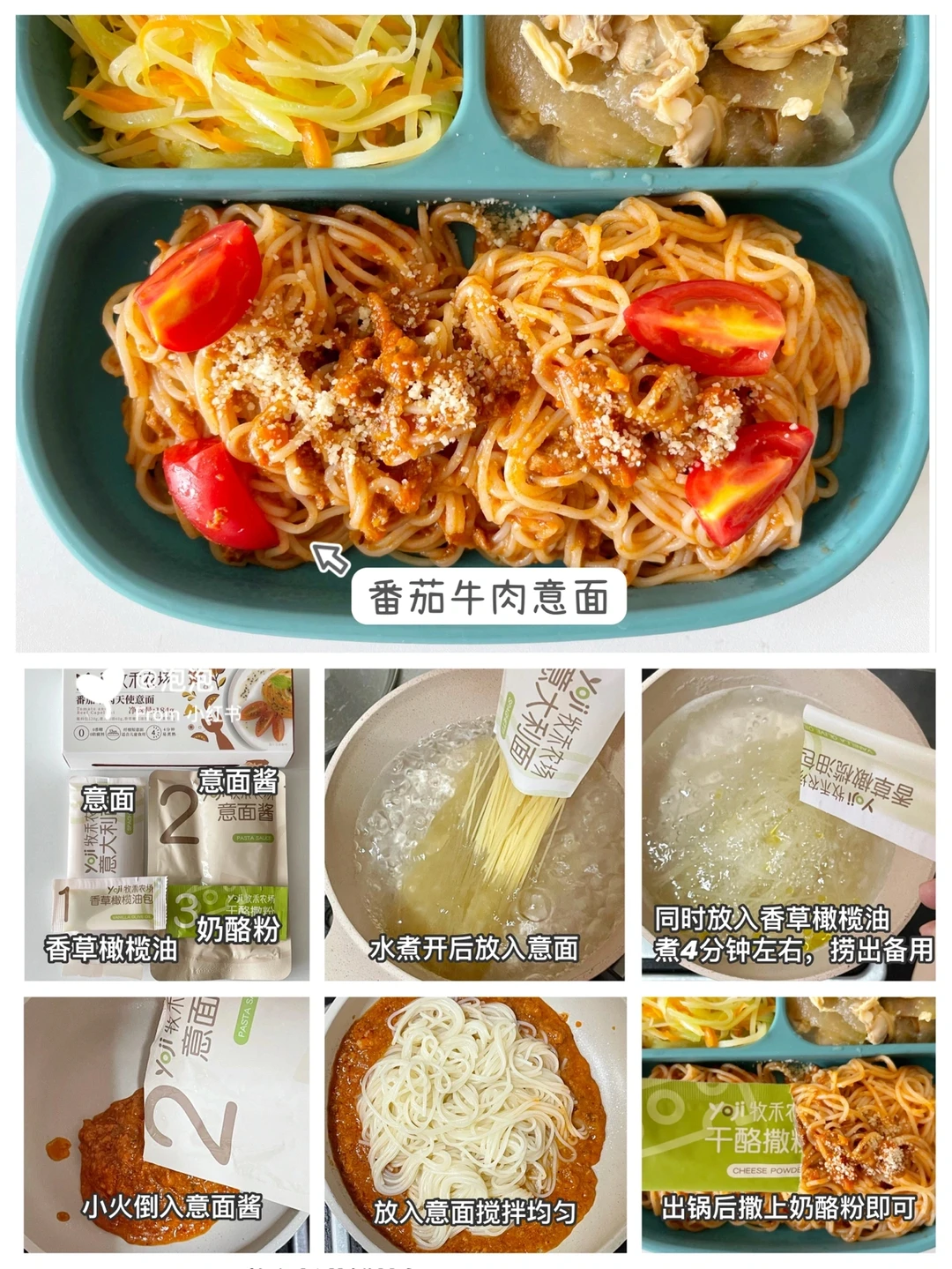 制作:水煮开后放入意面,香草橄榄油倒入锅中,煮4分钟捞出备用。小火加入番茄意面酱和意面,翻拌均匀,出锅后撒上芝士粉即可。