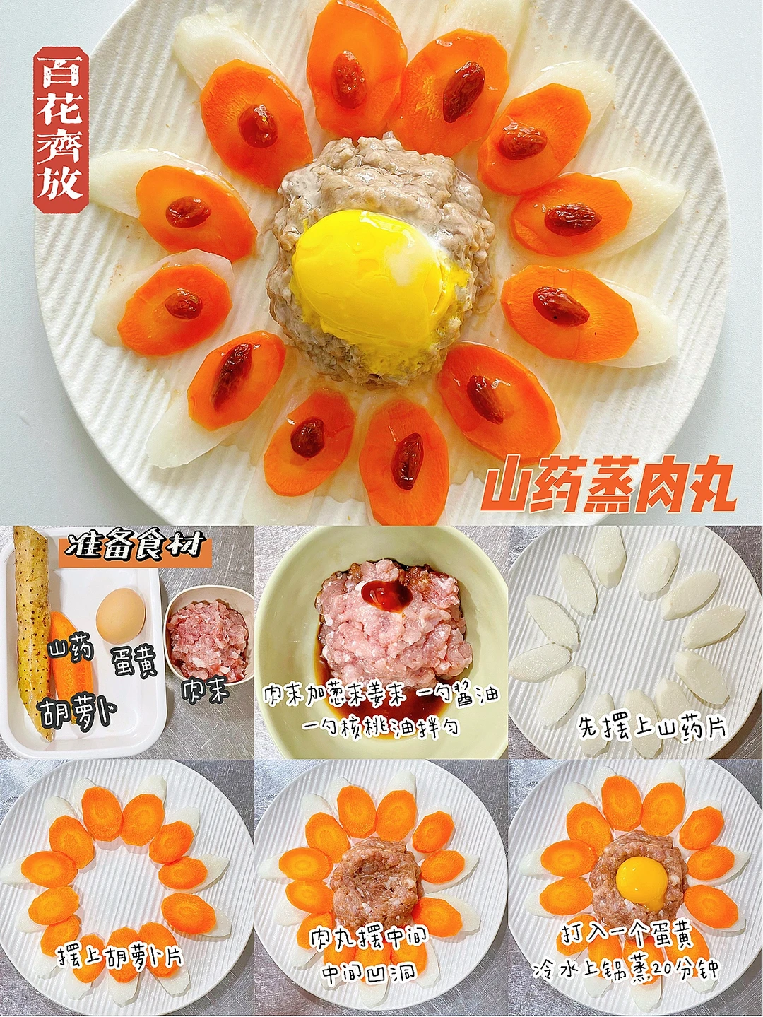 🔹制作方法:肉末加葱末、姜末、一勺酱油、适量核桃油搅拌均匀。山药片上摆上胡萝卜片,再点上枸杞,中间摆上肉丸,中间凹个洞,打入一个蛋黄,冷水上锅蒸20分钟。