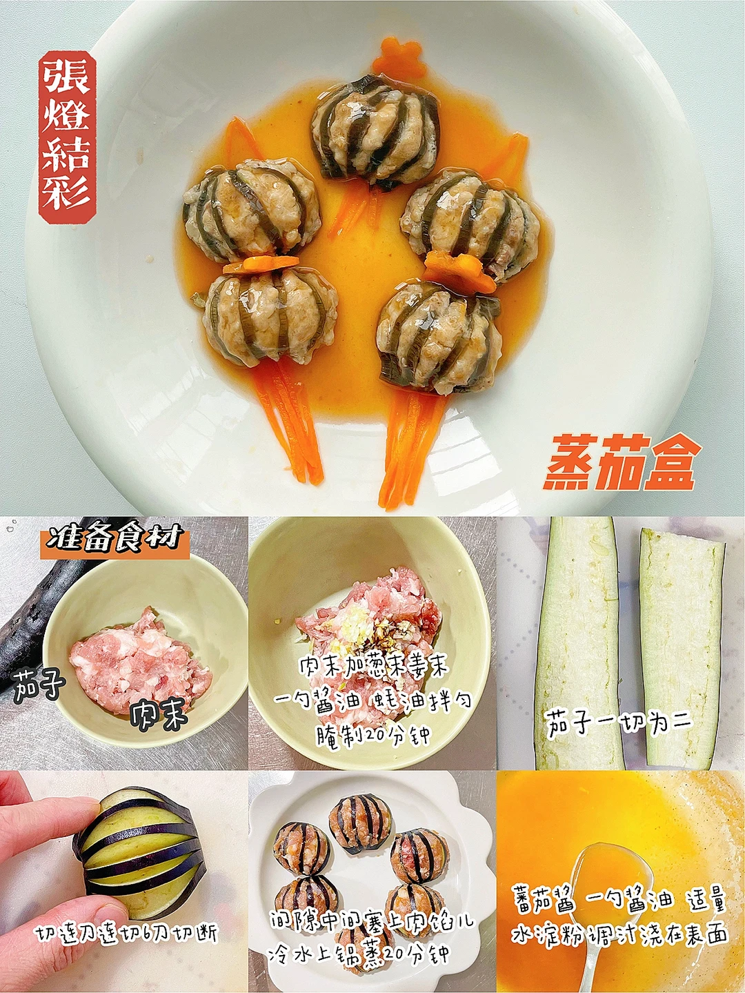 中间都塞上肉馅,冷水上锅蒸20分钟。番茄酱+酱油+水淀粉调成汁儿,浇在表面即可。