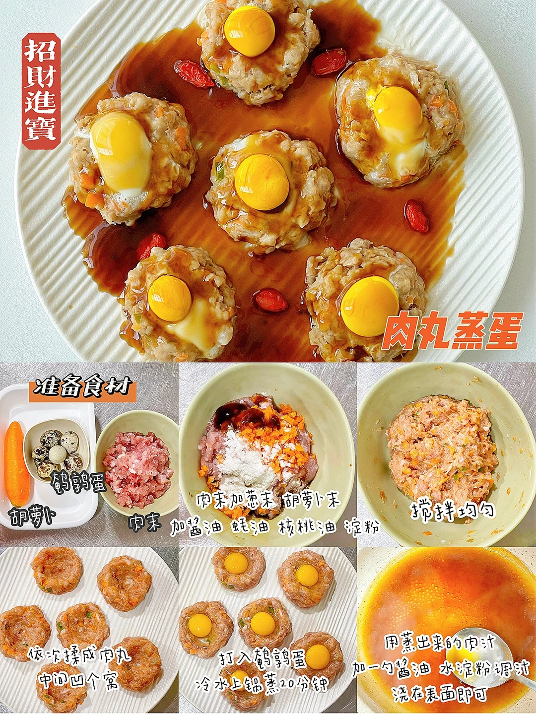 🔹制作方法:肉末加葱末、胡萝卜末、酱油、蚝油、核桃油、淀粉顺时针搅匀。依次揉成肉丸中间凹个窝,打入一个鹌鹑蛋,冷水上锅蒸20分钟。蒸出来盘中的汤汁倒入锅中,加一勺酱油和水淀粉勾芡,浇在表面即可。