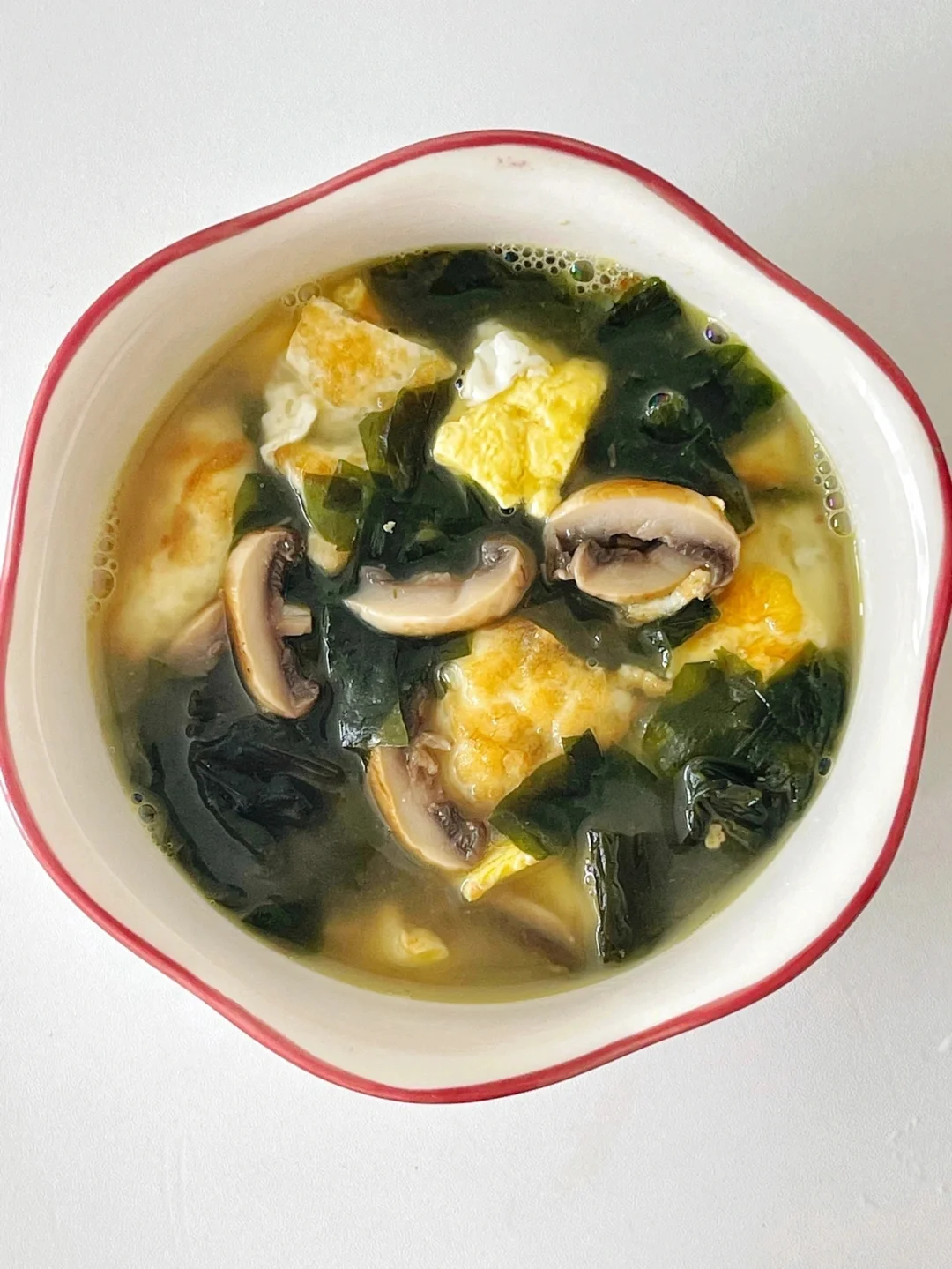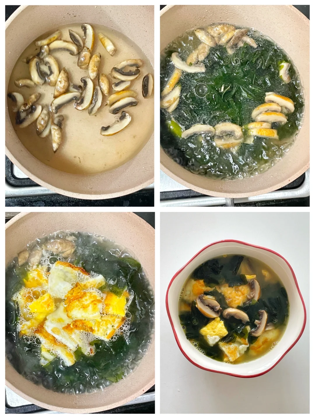 鲜掉眉毛的裙带菜煎蛋汤太好喝了,裙带菜含钙量高,1岁上的宝宝适合添加,大小根据宝宝的咀嚼力来改遍,每次做我都会多做一些,对于我就是一道美味的减脂汤。 ✅准备材料:裙带菜、鸡蛋2个、口蘑。 ⬇️制作方法:⬇️ 🔹裙带菜提前泡发好切碎。鸡蛋煎熟切小块。 🔹口蘑洗净去掉根蒂,小火两面煎,煎到口蘑底部汁水出来,用剪刀剪成小块. 🔹倒入适量的清水,煮开后,放入裙带菜和煎蛋, 🔹煮一会,加一点盐调味,关火滴几滴芝麻油出锅即可。