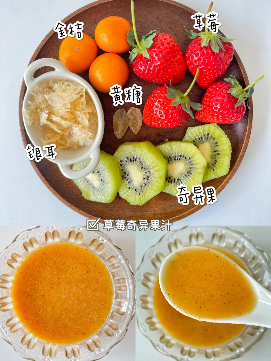 🌟食材:草莓4颗、奇异果1个、金桔3个、银耳5克、黄糖适量