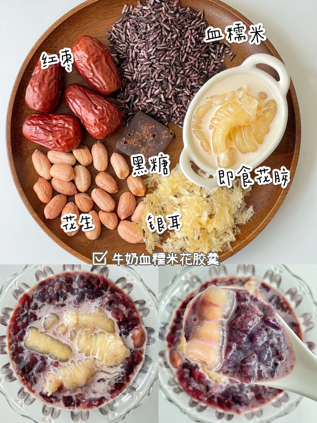 🌟食材:血糯米80克、即食花胶、银耳、红枣4颗、花生适量、黑糖一块