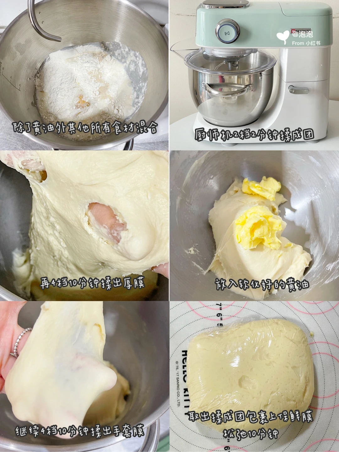 🔹除了黄油外其他所有食材混合,厨师机2档2分钟揉成团,再用4档10分钟揉出厚膜,放入软化好的黄油,继续揉10分钟,揉出手套膜。