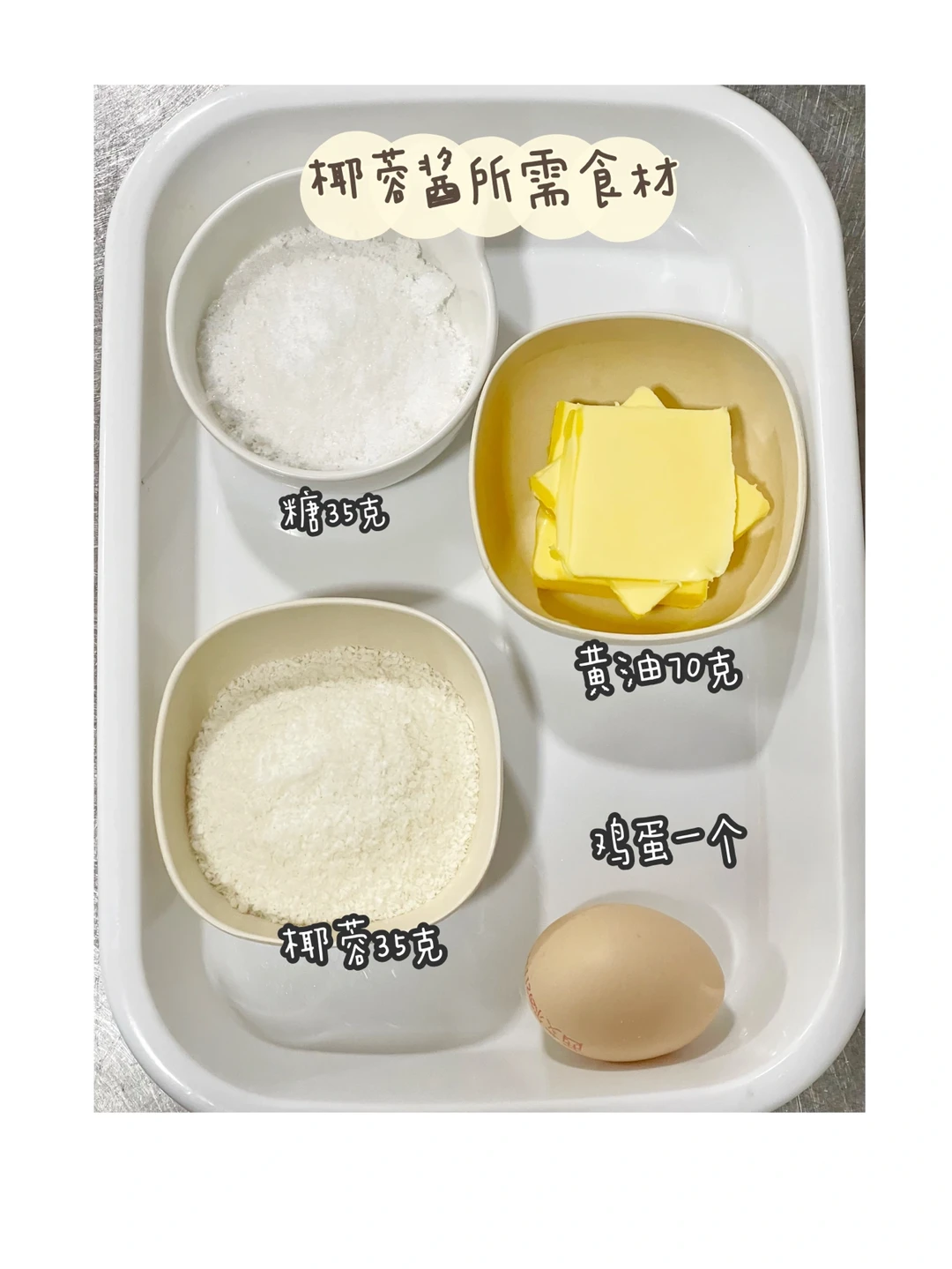 ✅椰蓉酱所需食材:黄油70克、椰蓉35克、糖35克、鸡蛋一个。