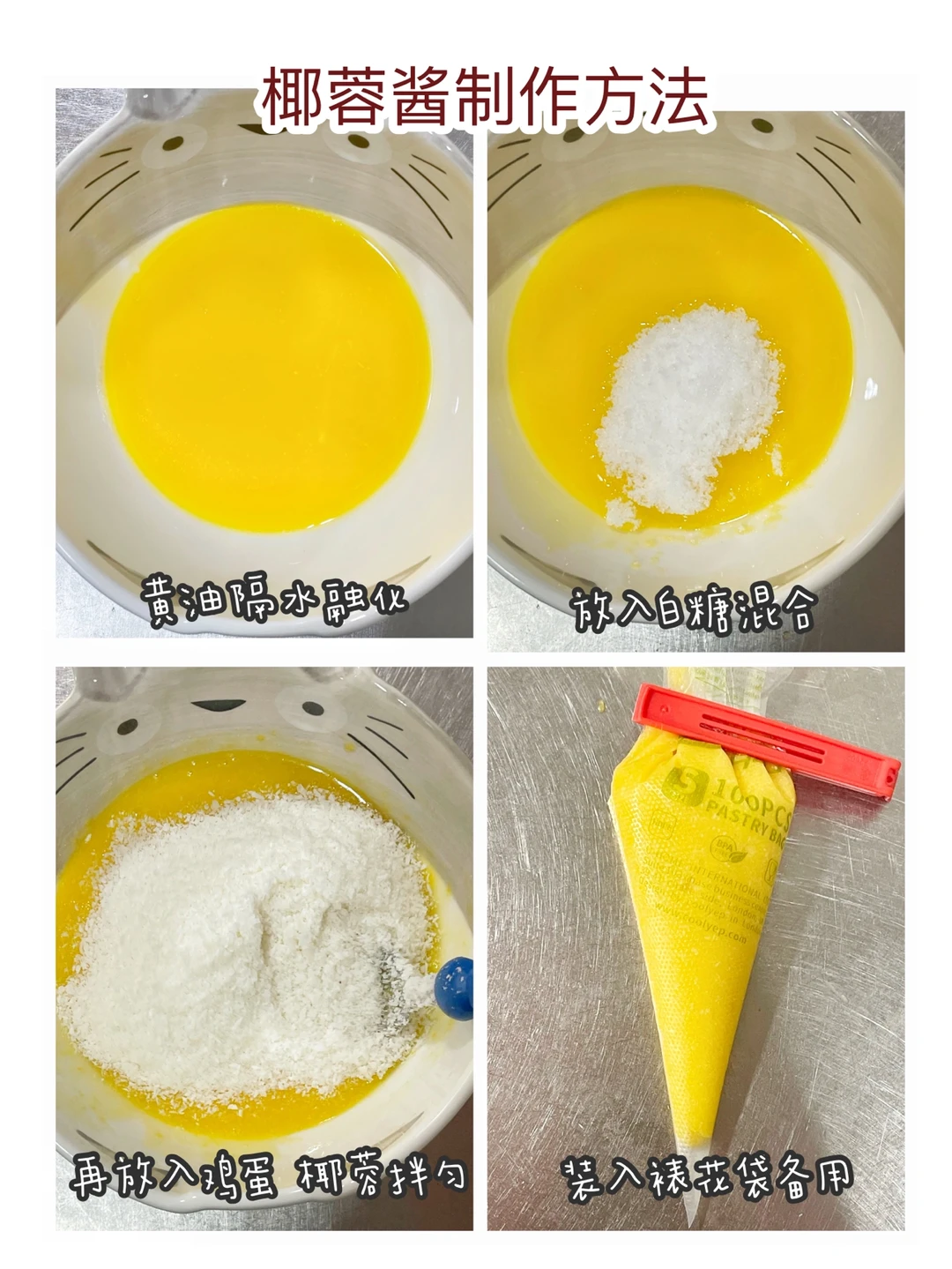 🔹黄油隔水融化,依次放入白糖、鸡蛋、椰蓉混合。装入裱花袋备用。