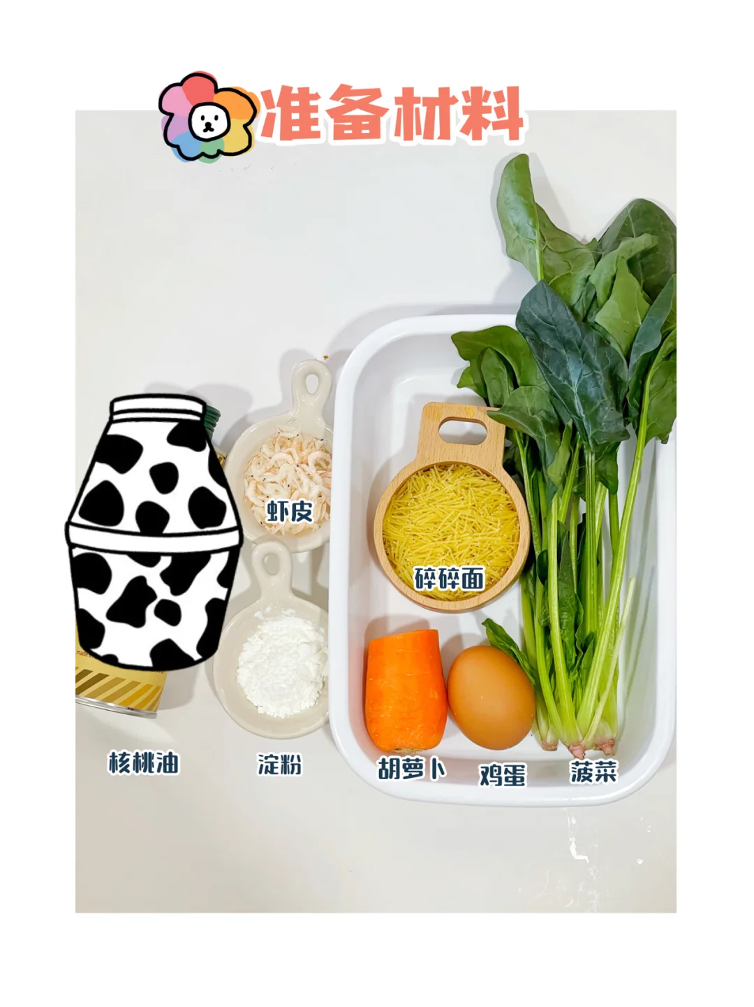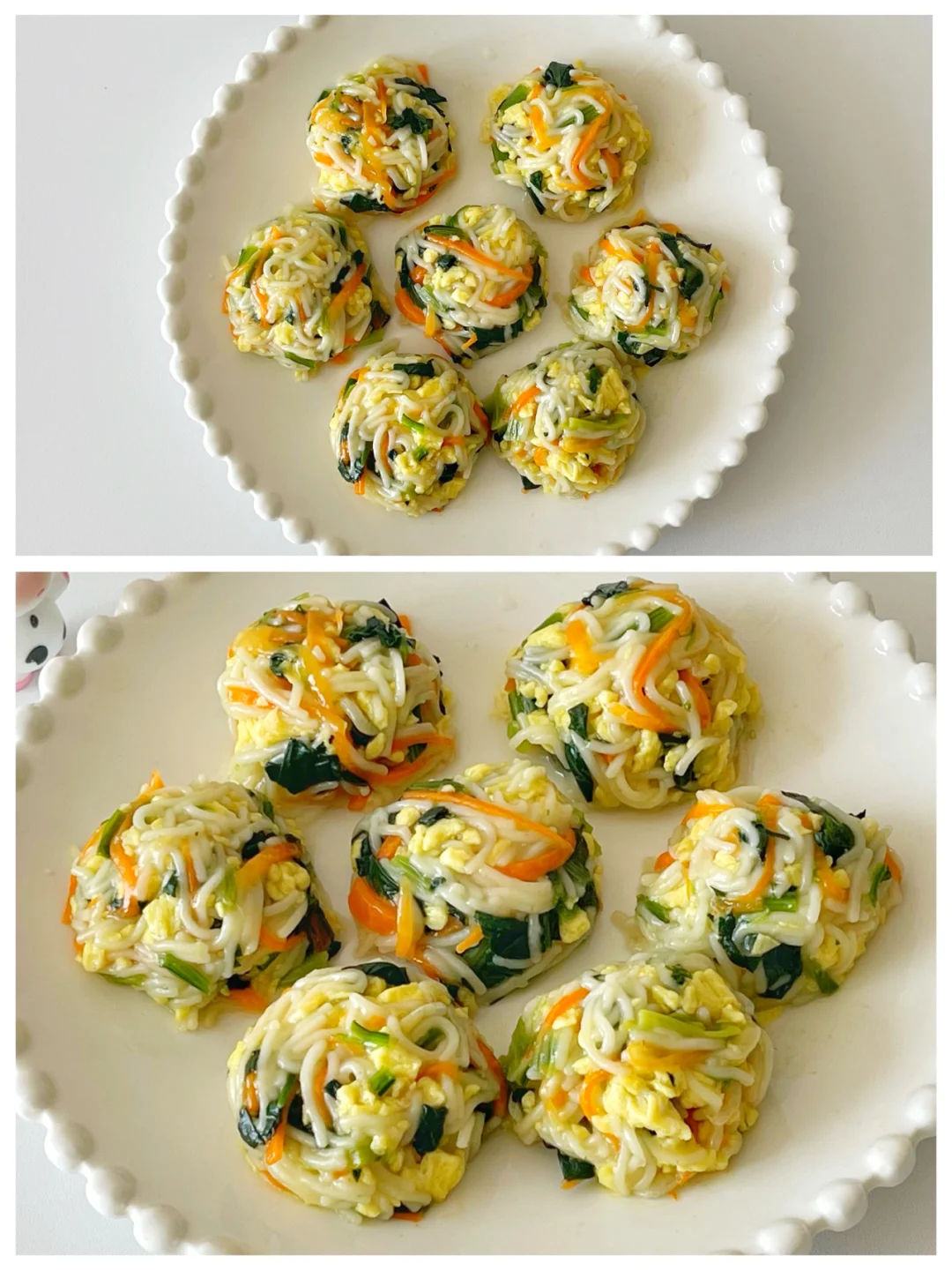 好吃又营养的蒸丸子系列又新添加一道,都是常见的食材,搅拌在一起蒸出来的味道绝了,小月龄宝宝也可以拿来当手指食物哦[斜眼R] ✅准备材料:菠菜、胡萝卜、鸡蛋、虾皮、核桃油、碎碎面、淀粉. ⬇️制作方法:⬇️ 🔹鸡蛋炒熟备用(尽量炒碎一些),菠菜焯水切碎,胡萝卜焯水切丝,碎碎面煮熟捞出备用。 🔹把所有的食材混合,放2勺淀粉,滴几滴核桃油拌匀. 🔹依次取适量搓成大小均等的丸子状,水开蒸5分钟即可。 ❗️1岁+宝宝也可以加一点盐调味.