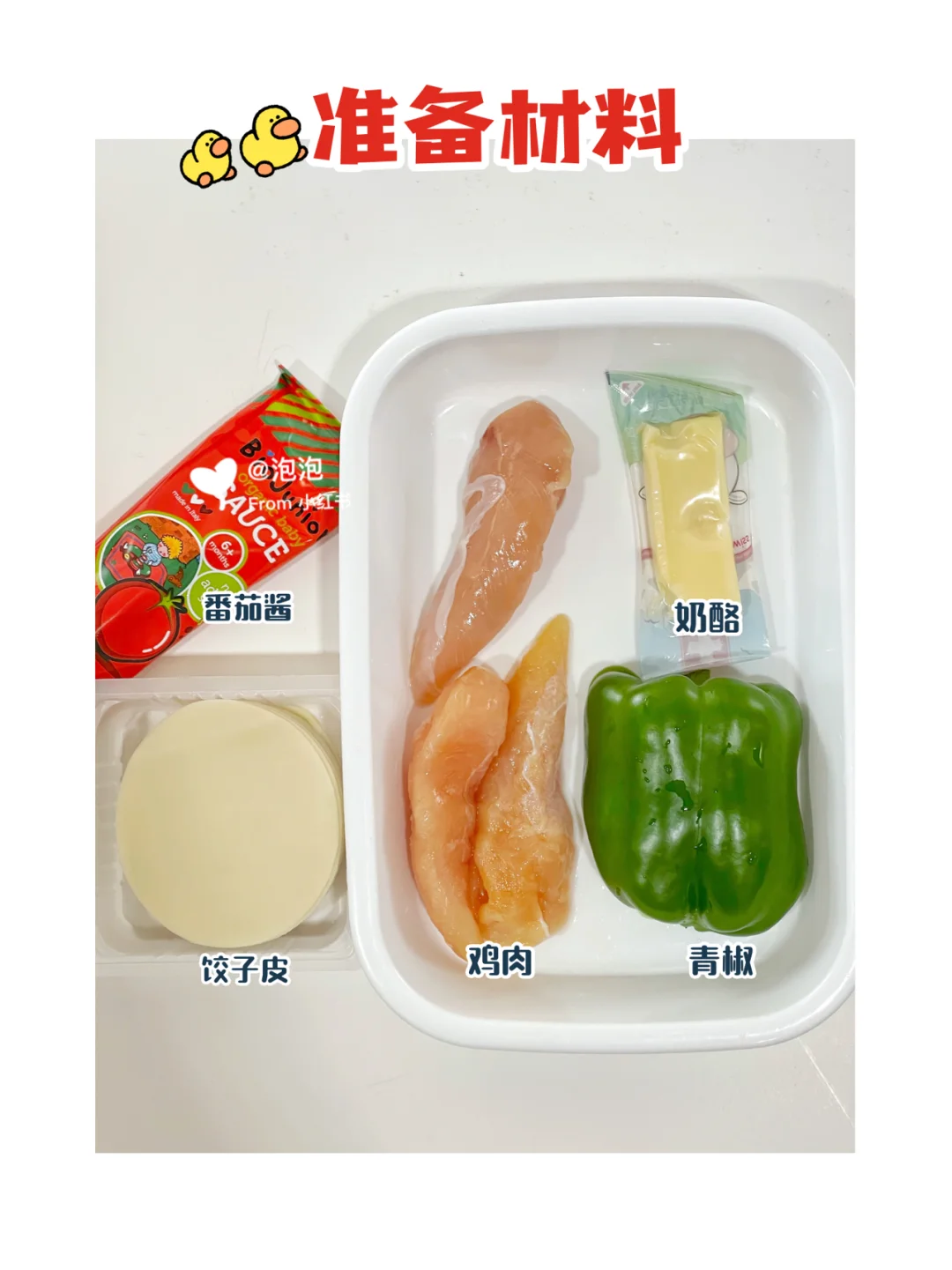 ✅准备材料:鸡肉、青椒、饺子皮、番茄酱。