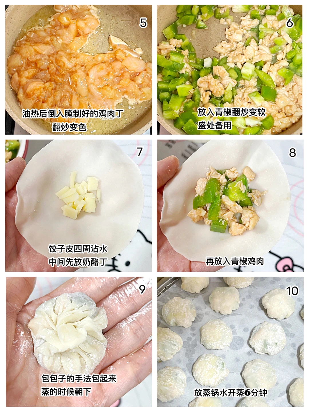 🔹饺子皮四周沾水,中间先放入奶酪铺底,再放上青椒鸡肉丁,像包包子的手法转圈捏褶捏紧口,