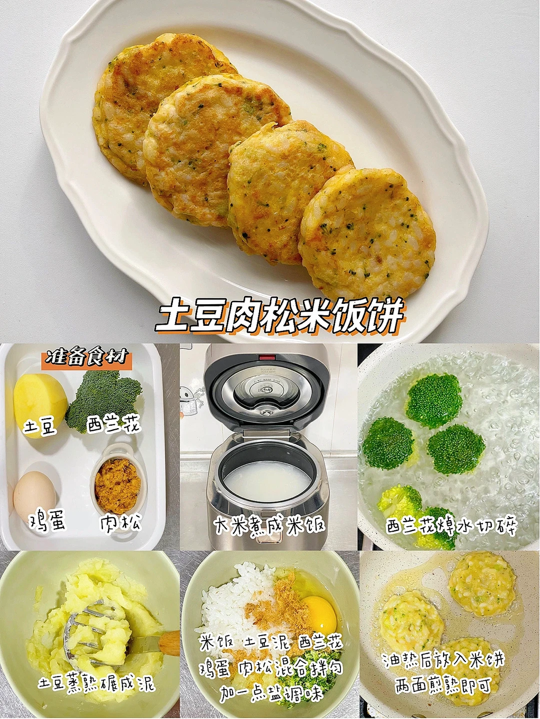 🔹米饭+土豆泥+西兰花碎+鸡蛋+肉松混合搅匀,加盐调味。锅中油热后,放入小饼两面煎熟即可。
