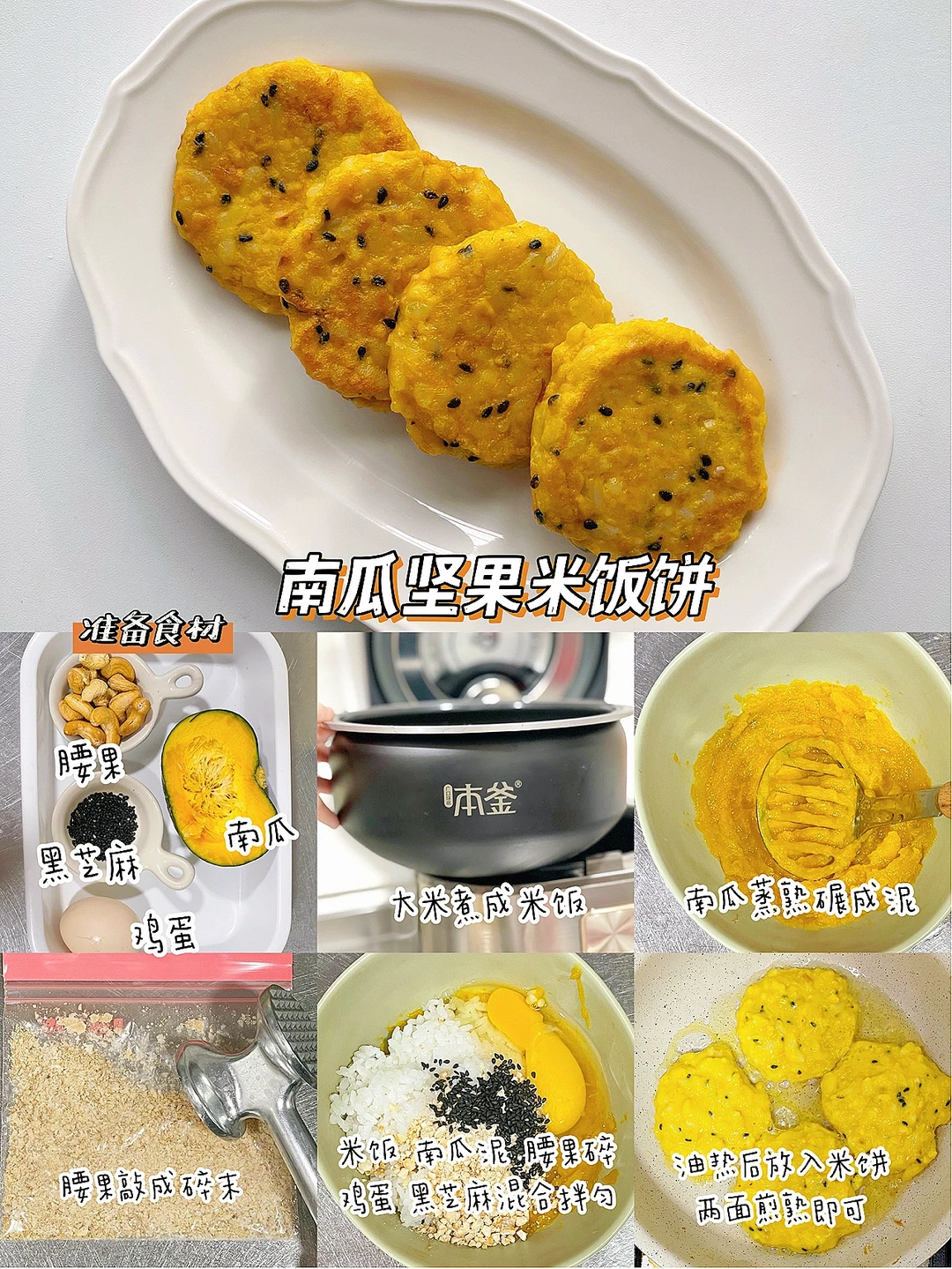 🌟准备食材:米饭、南瓜、腰果、黑芝麻、鸡蛋