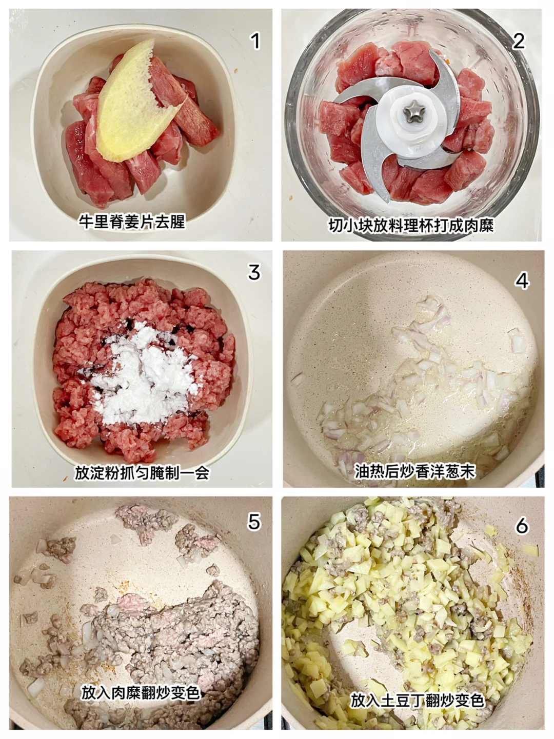 🔹牛肉提前用姜片去腥,切小块放料理杯打成肉糜。放一勺淀粉抓匀腌制一会。