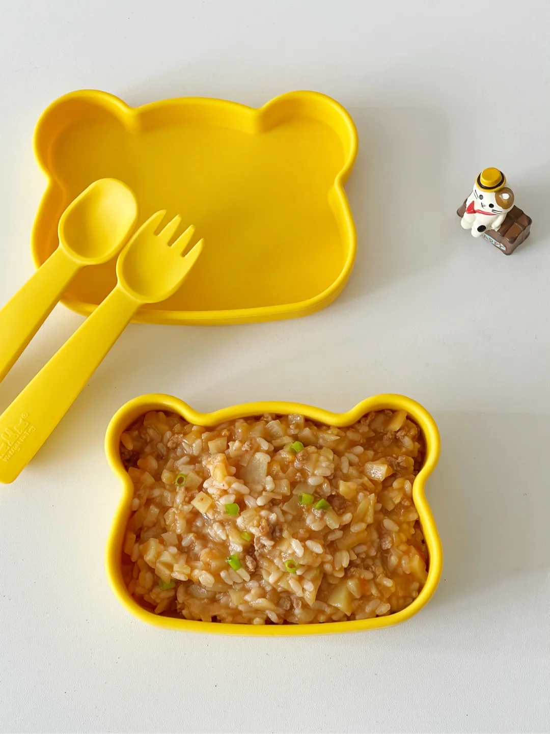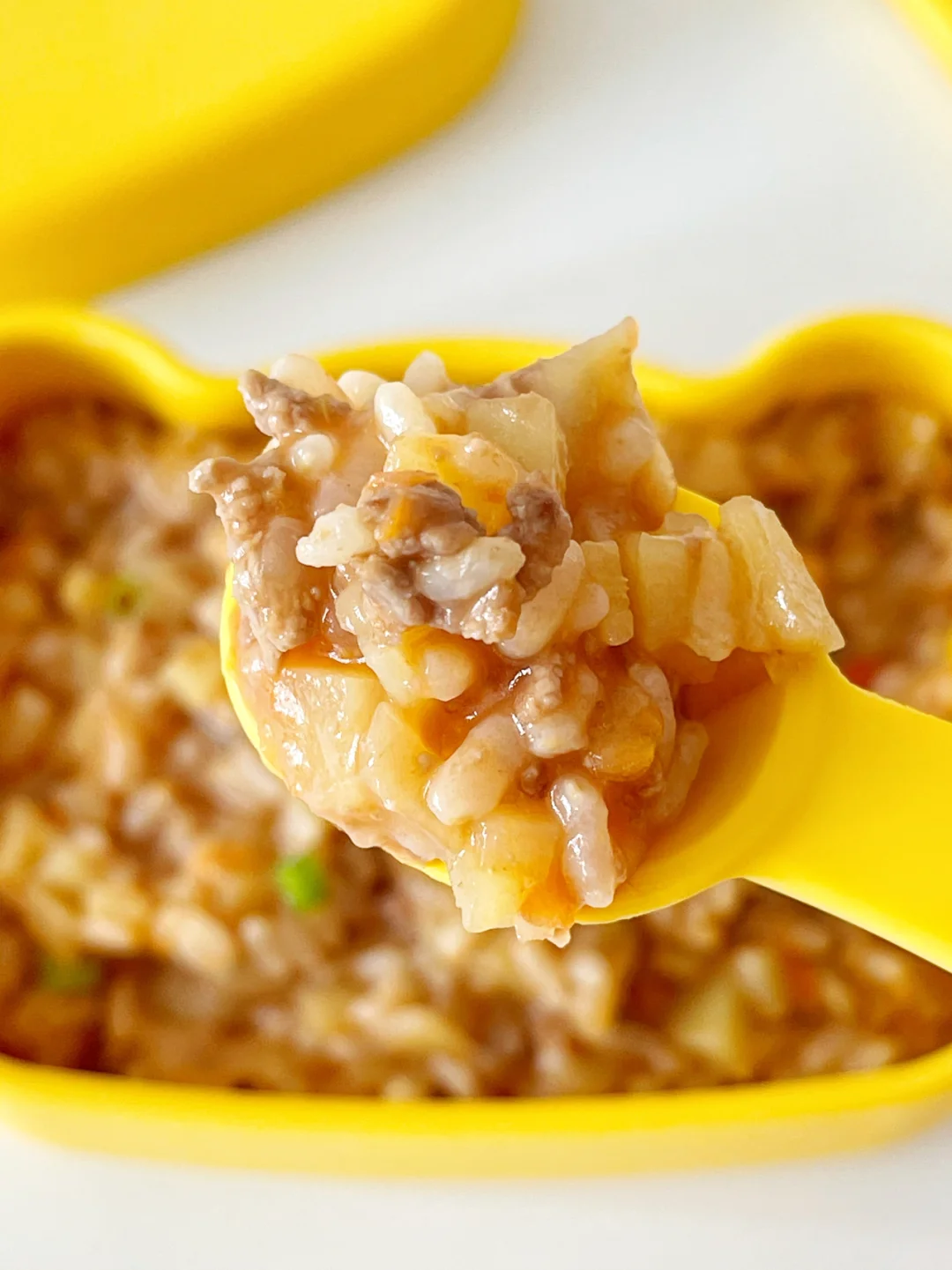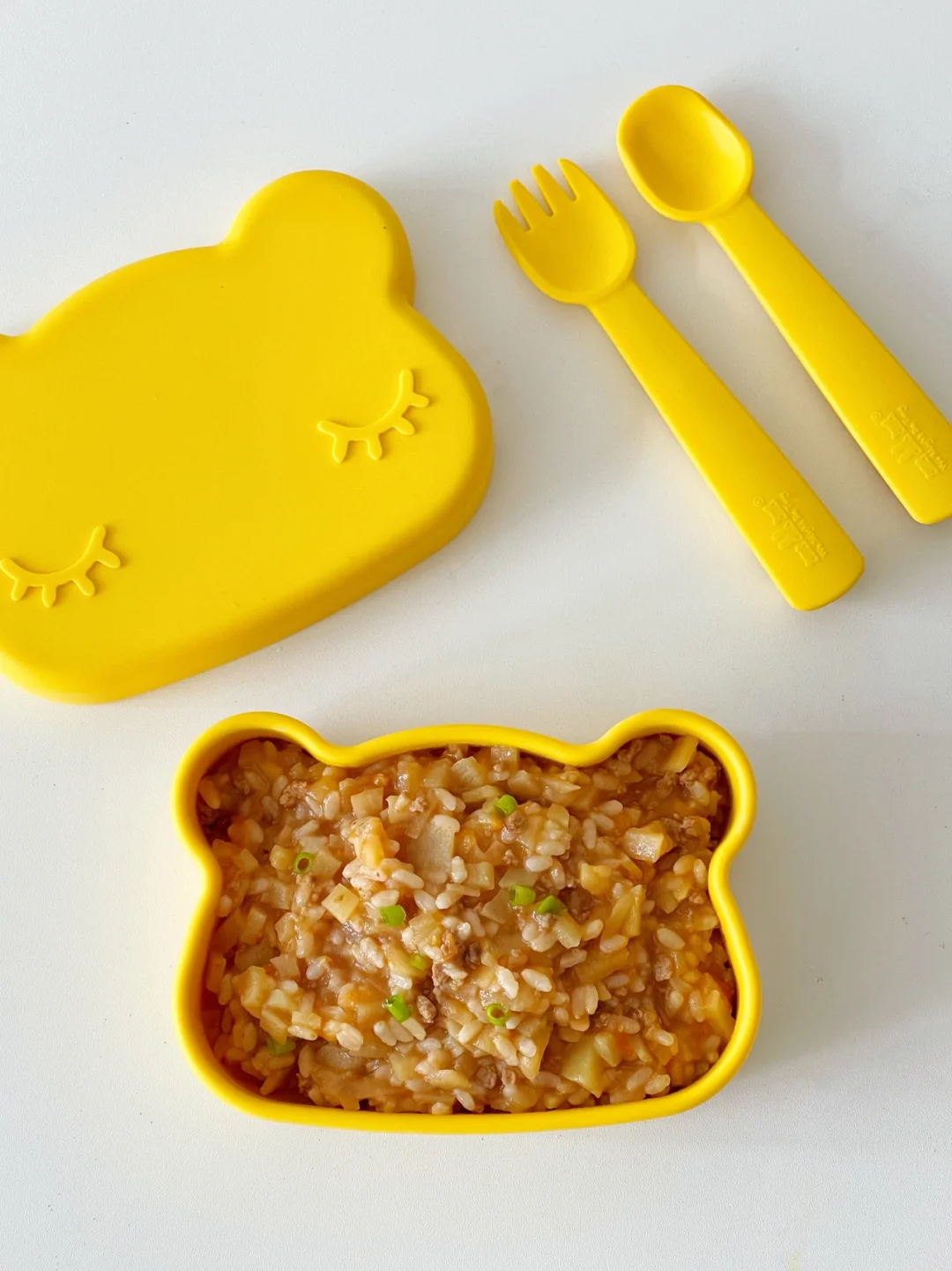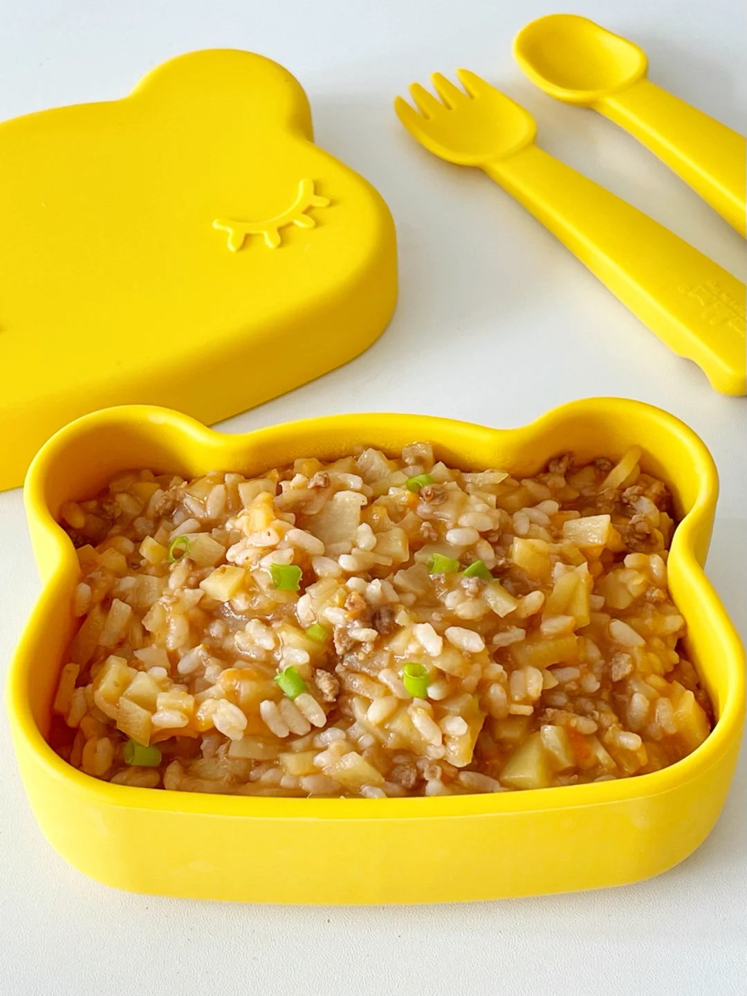 今天安排了茄汁牛肉烩饭,口感酸酸甜甜,每次做宝宝都可以吃到光盘。(餐 盘:咪兔熊 ,可耐高温230度-40低温,造型可爱,简约有设计感,可以从小提升宝宝的审美,吃饭也更有仪式感)