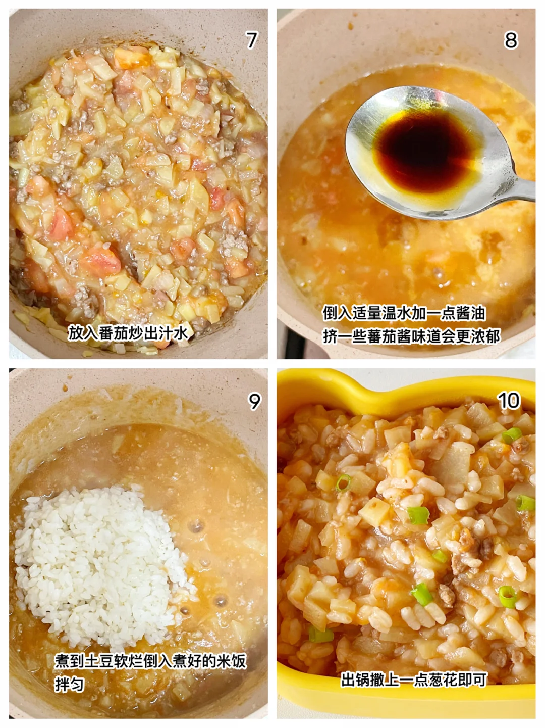 🔹煮到土豆软烂,拌入米饭拌匀(小月龄的宝宝米饭可以多焖煮一会),出锅撒上一点葱花即可。