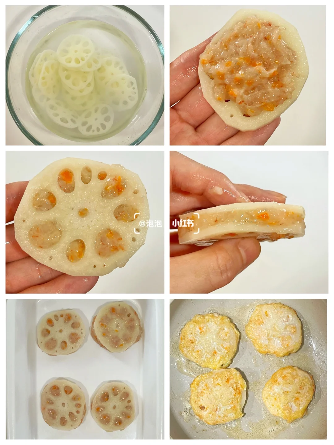 虾肉版的藕夹真的太好吃了,外脆里嫩,宝宝超喜欢。 ✅准备食材:莲藕、虾仁、胡萝卜、鸡蛋、淀粉。 ⬇️制作方法:⬇️ 🔹胡萝卜焯水切碎末。鸡蛋打散备用。 🔹虾仁柠檬片去腥,剁成虾泥。虾泥里放一勺酱油、一勺淀粉、胡萝卜末搅拌均匀。 🔹莲藕去皮切薄片(越薄越好)上面均匀的码上虾泥,再在上面盖上一片莲藕。 🔹做好的藕夹蘸取蛋液,锅中油热后,小火两面煎至金黄即可(❗️想要莲藕口感软的,可以加点热水,盖上锅盖收干水份即可)