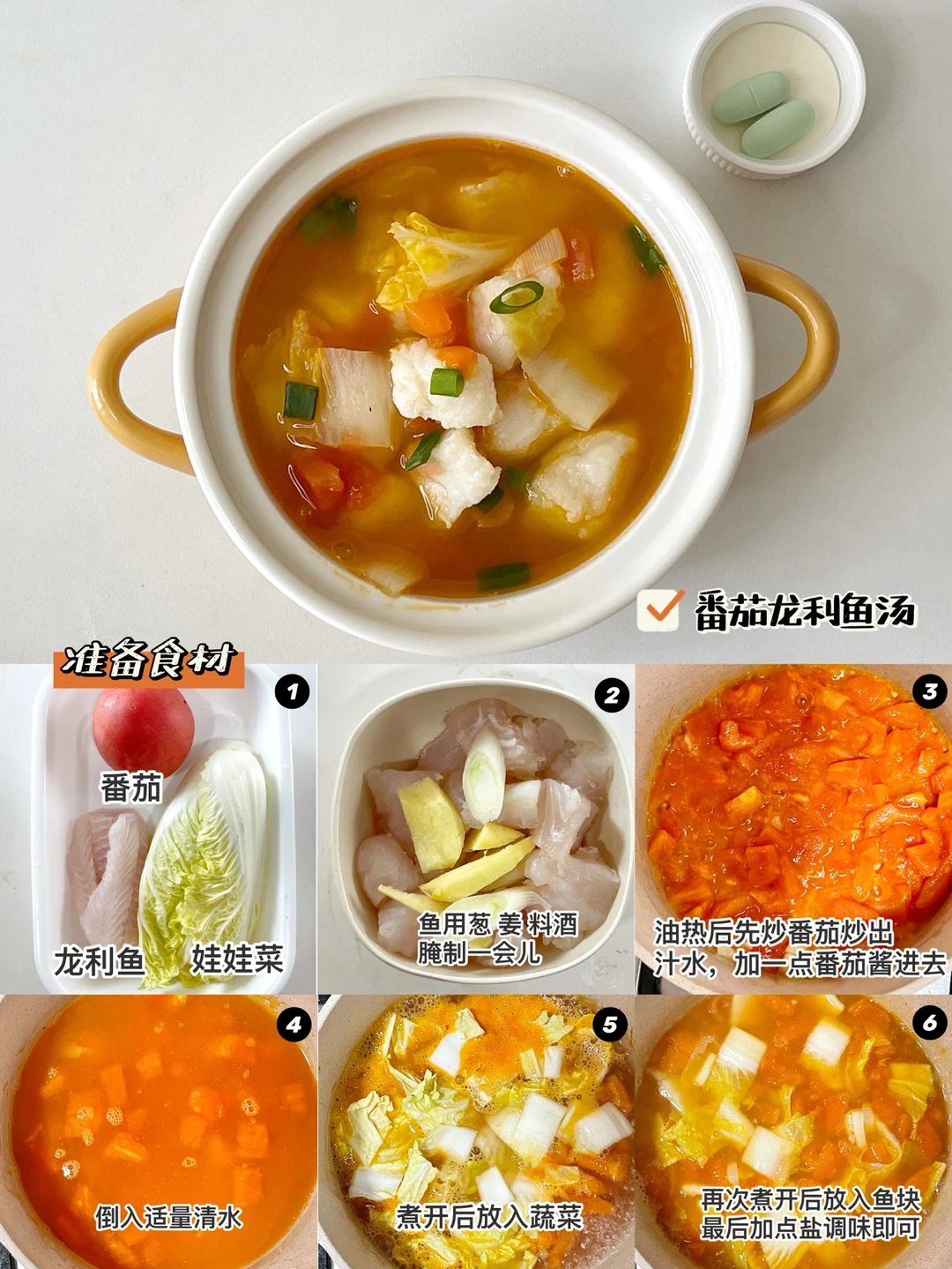 🔹制作:龙利鱼用葱、姜、料酒腌制一会。油热后放入番茄炒出汁水,加一勺番茄酱,倒入适量清水,煮开后放入蔬菜,再次煮开后放入裹上淀粉的鱼块,最后盐调味即可。