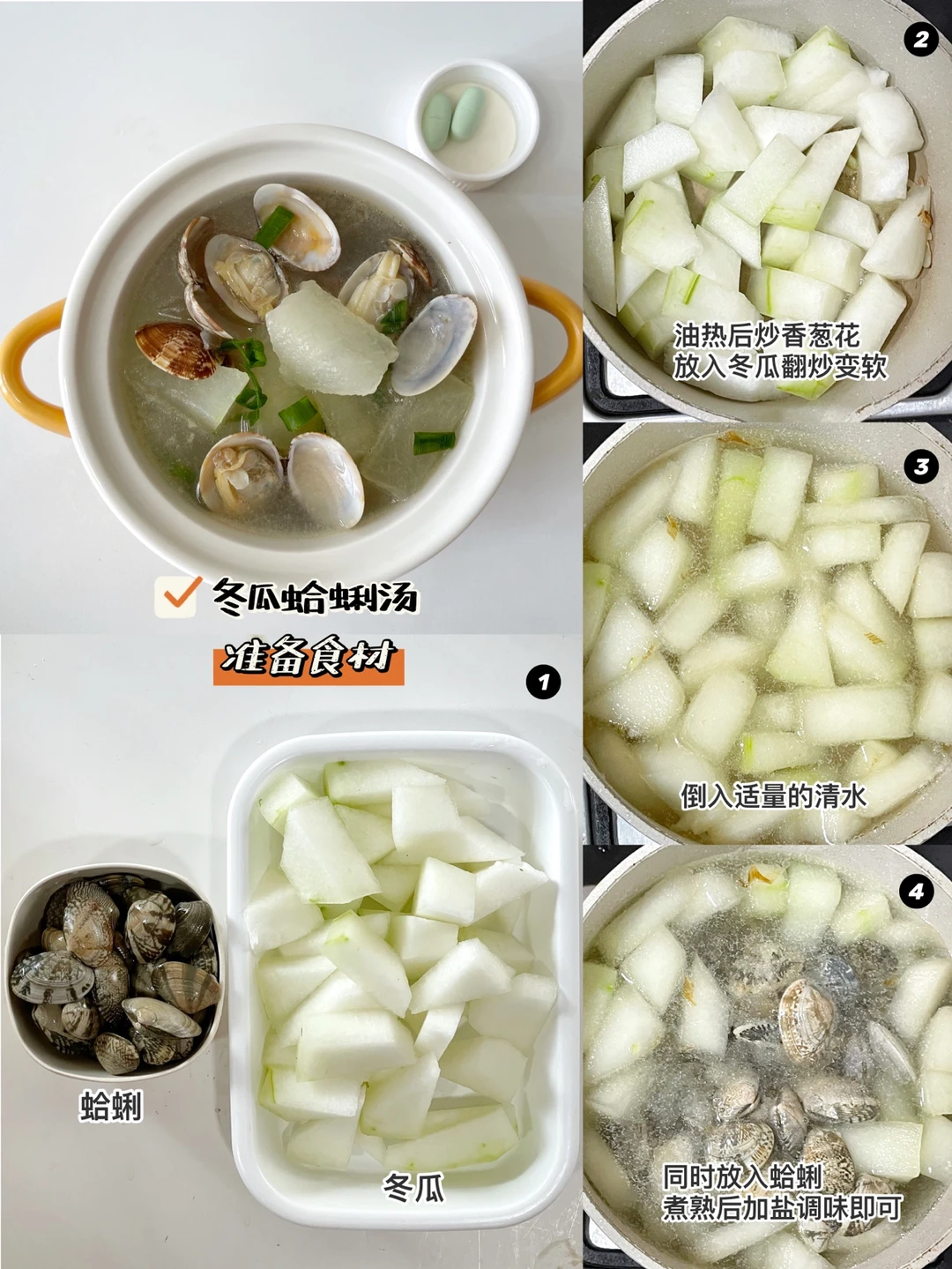 🔹制作:蛤蜊洗净,冬瓜去皮切小块。油热后,炒香葱花放入冬瓜翻炒变色。倒入适量清水,同时放入蛤蜊,煮到冬瓜软烂,加盐调味,出锅后撒点葱花即可。