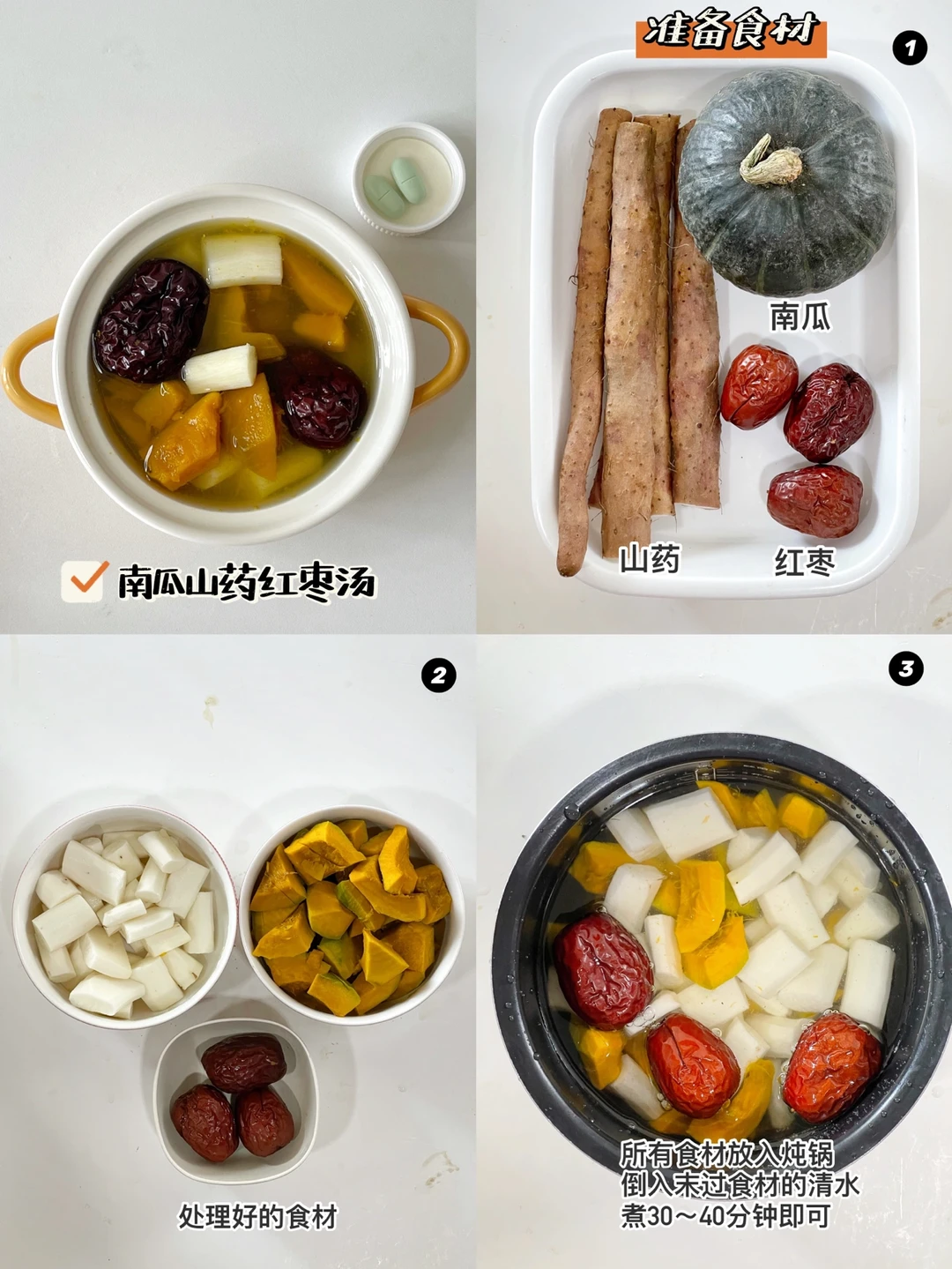 🔹制作:山药去皮切小段,南瓜去皮切块,山药+南瓜+红枣放入炖锅,倒入末过食材的清水,煮开后转中小火煮到食材软烂即可