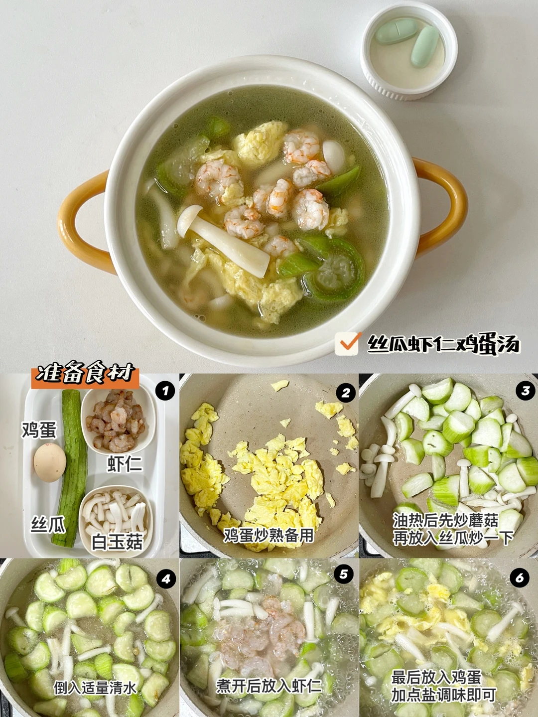 🔹制作:鸡蛋炒熟盛出备用。油热油放入白玉菇和角瓜翻炒一下,倒入适量清水,煮开后放入虾仁,最后放入鸡蛋,加盐调味.