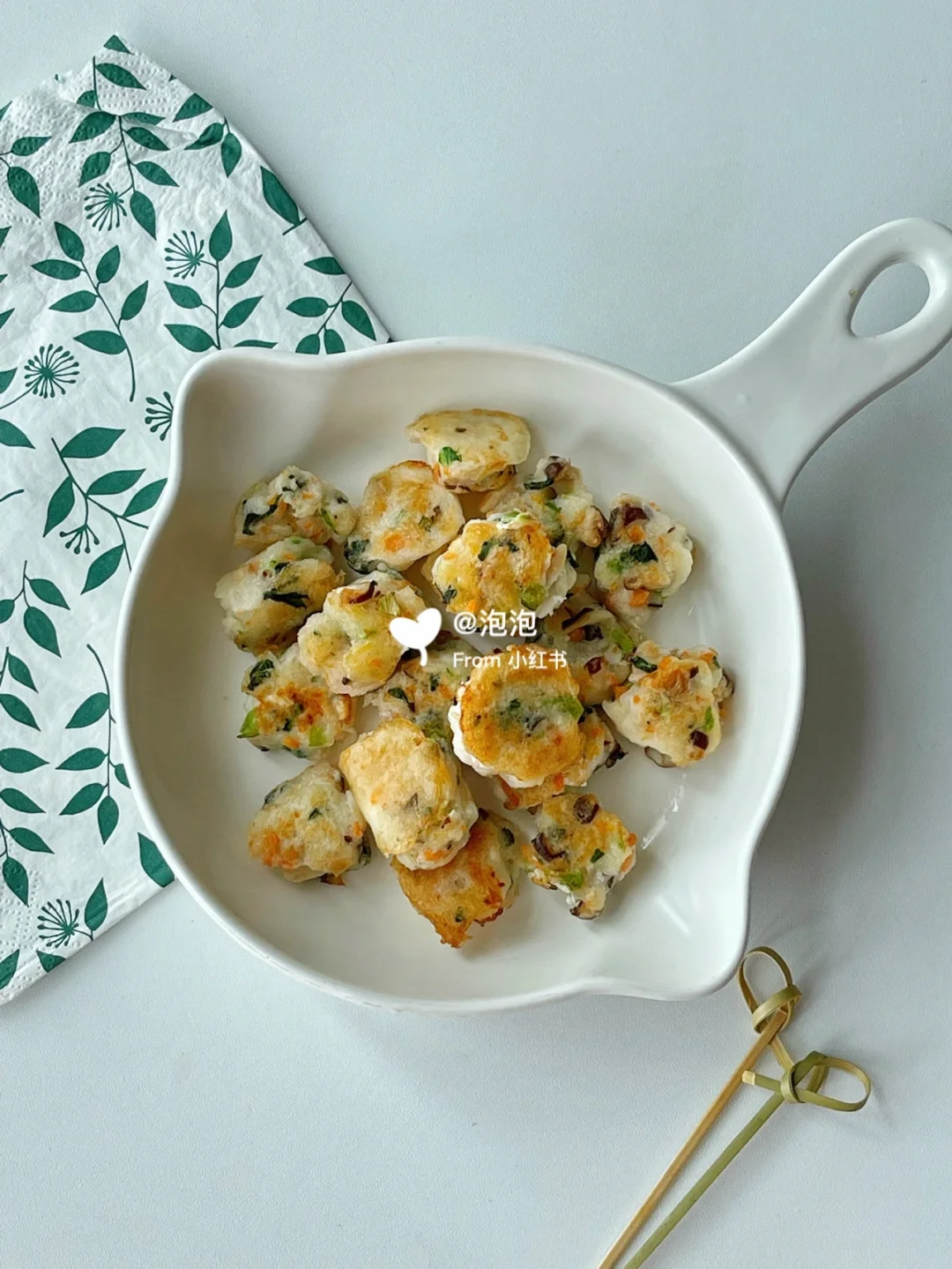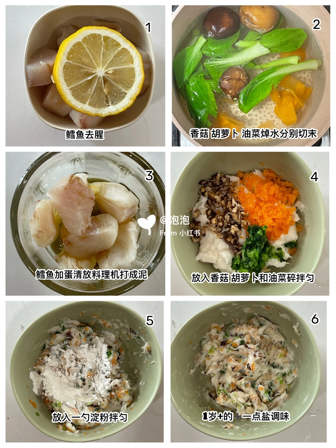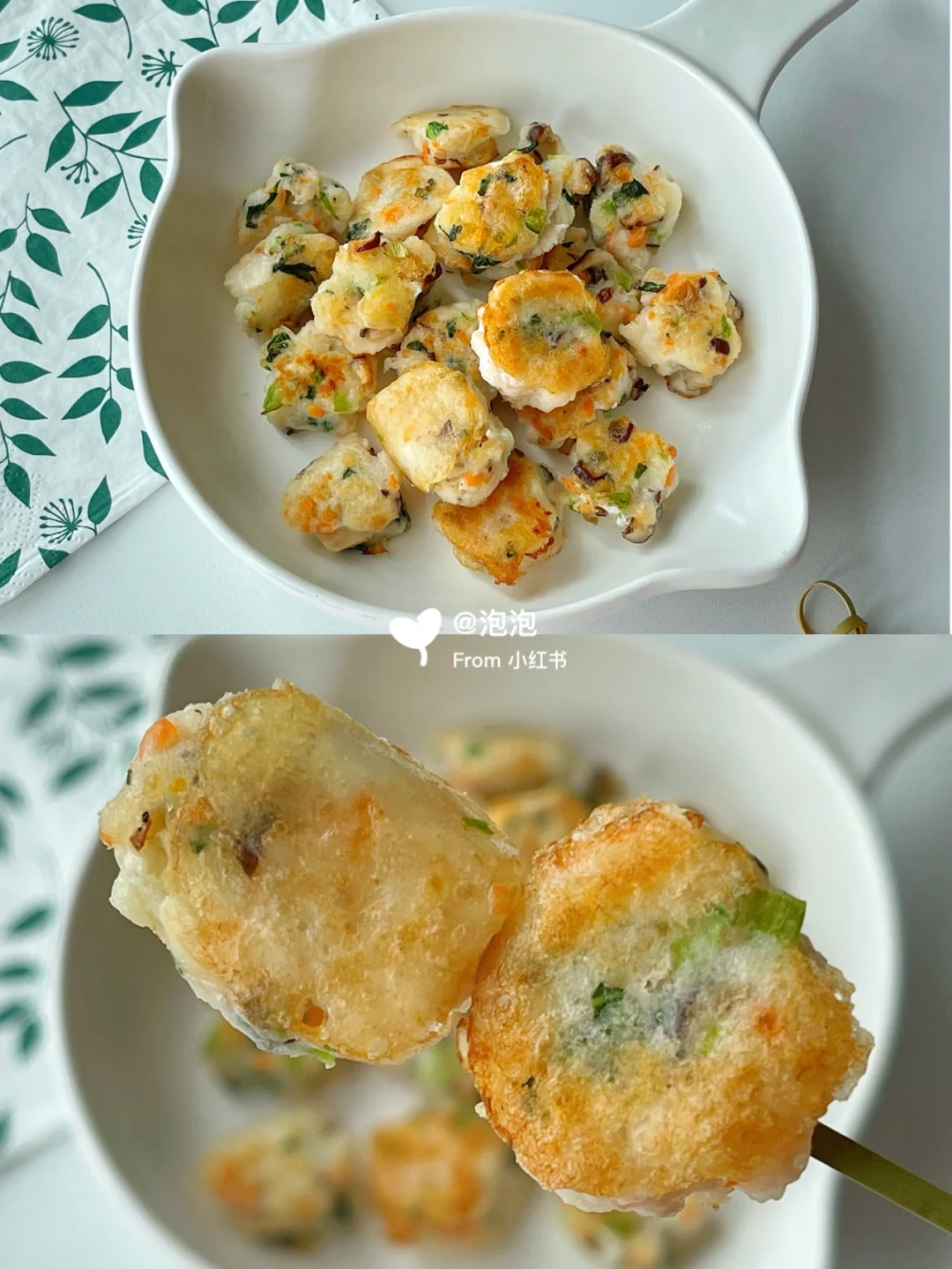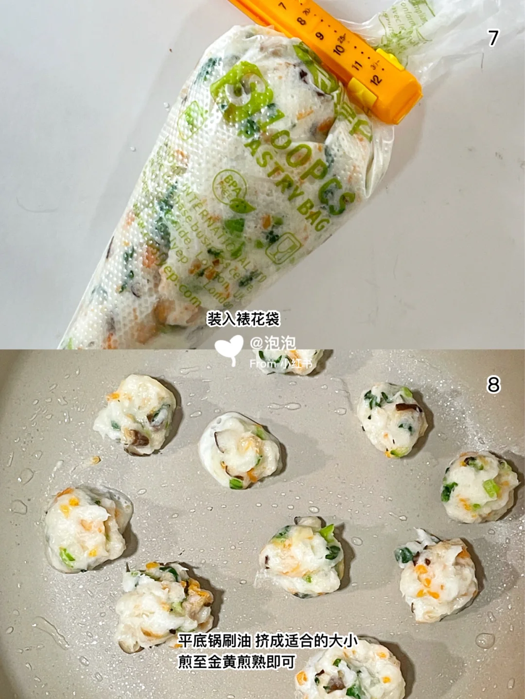 之前做过虾肉一口酥宝宝很爱吃,今天做了鳕鱼版本的,效果一样很棒哦,好吃到分分钟光盘。 ✅准备食材:鳕鱼90克,蛋清一个,油菜,胡萝卜,香菇,淀粉适量。 ⬇️制作方法:⬇️ 🔹油菜、胡萝卜、香菇焯水分别切碎. 🔹鳕鱼提前去腥,和蛋清一起放料理机打成泥. 🔹放入油菜、胡萝卜、香菇碎、淀粉搅拌均匀(1岁加的加一点盐)装入裱花袋, 平底锅刷油,挤入适合的大小,煎熟即可。