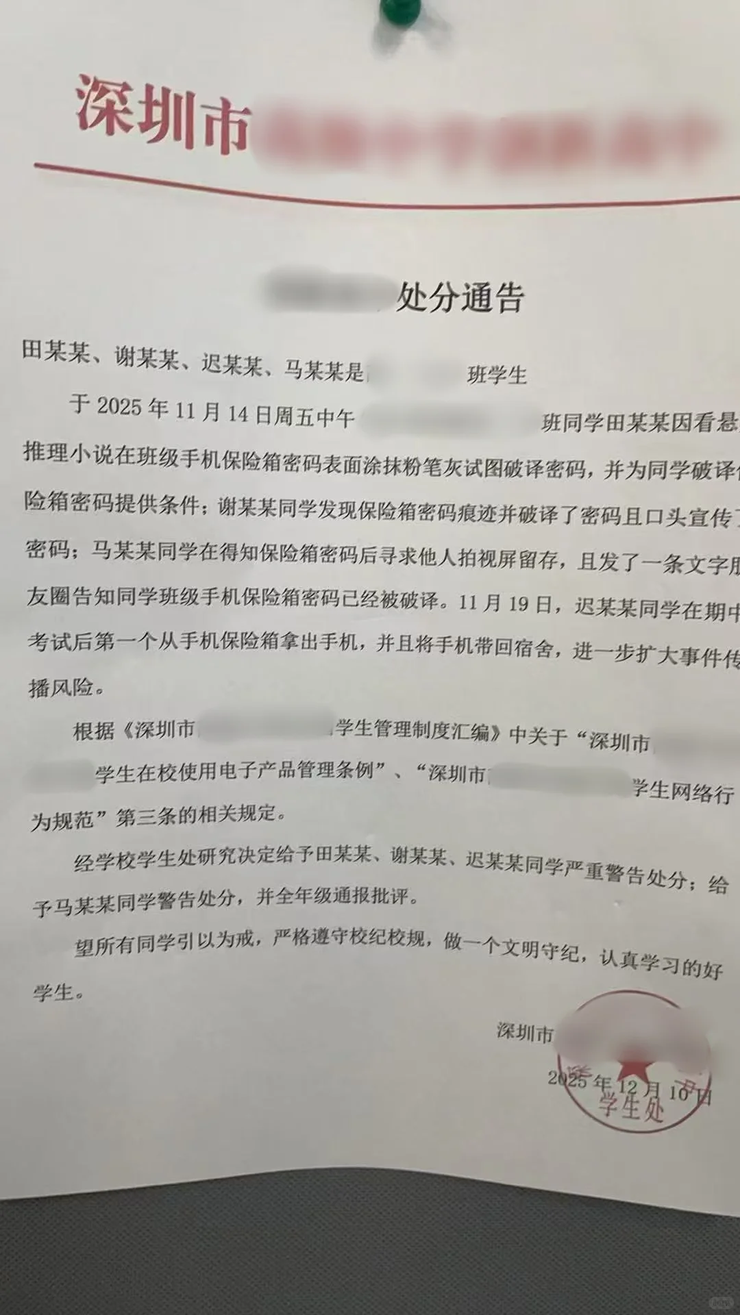 近日,一份文字显示为深圳某高中发布的处分通告在网上流传并引发热议。通告显示,该校高一13班多名学生因受悬疑小说启发,协同破解班级手机保险箱密码、传播密码并取走手机,受到校方纪律处分。12月15日,上游新闻记者从该校办公室负责人处获悉,网上流传的通告属实,通告本属内部处理文件,被个别学生发到了网上。