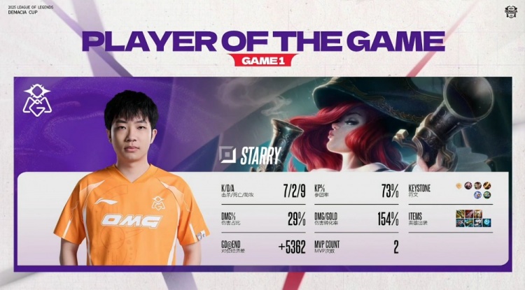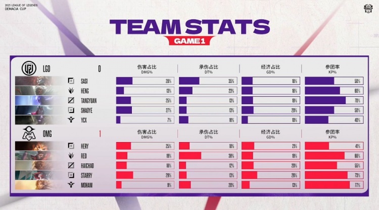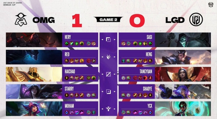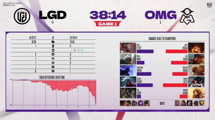 后期OMG来开大龙,Moham妮蔻绕后开LGD四人,OMG打出1换5团灭LGD后一波推平基地拿到比赛胜利。