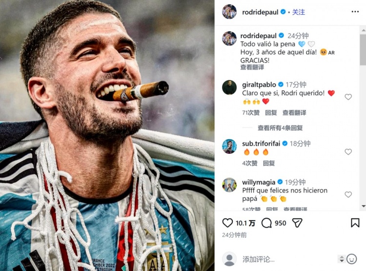 在社交媒体上,德保罗晒出了自己叼着雪茄,身上披着球网的照片,并写道:一些都值得!今天,是那个特别日子的纪念日!
