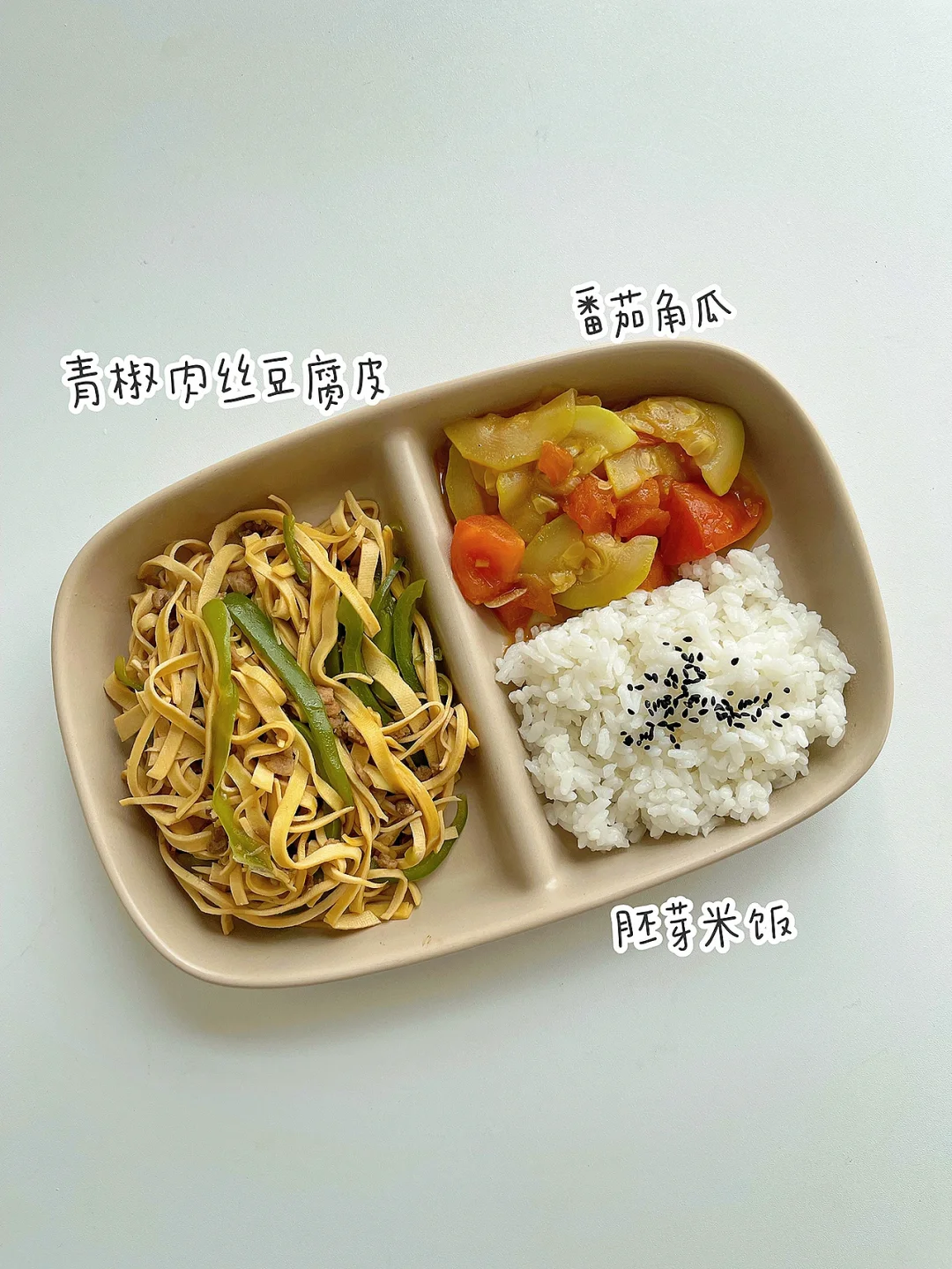 ✅周日:青椒肉丝豆腐皮、番茄角瓜、胚芽米饭
