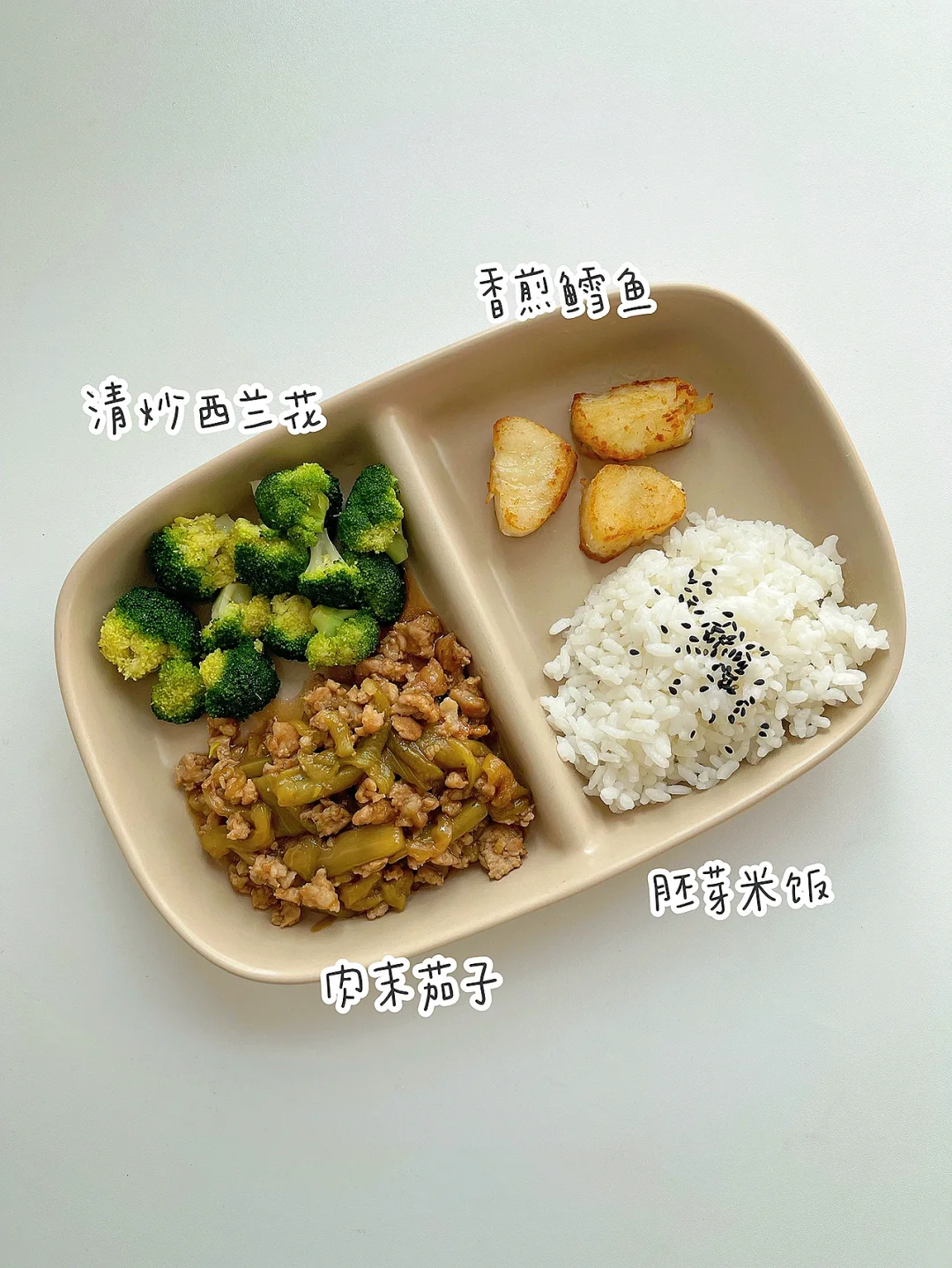 ✅周六:肉末茄子、香煎鳕鱼、清炒西兰花、胚芽米饭
