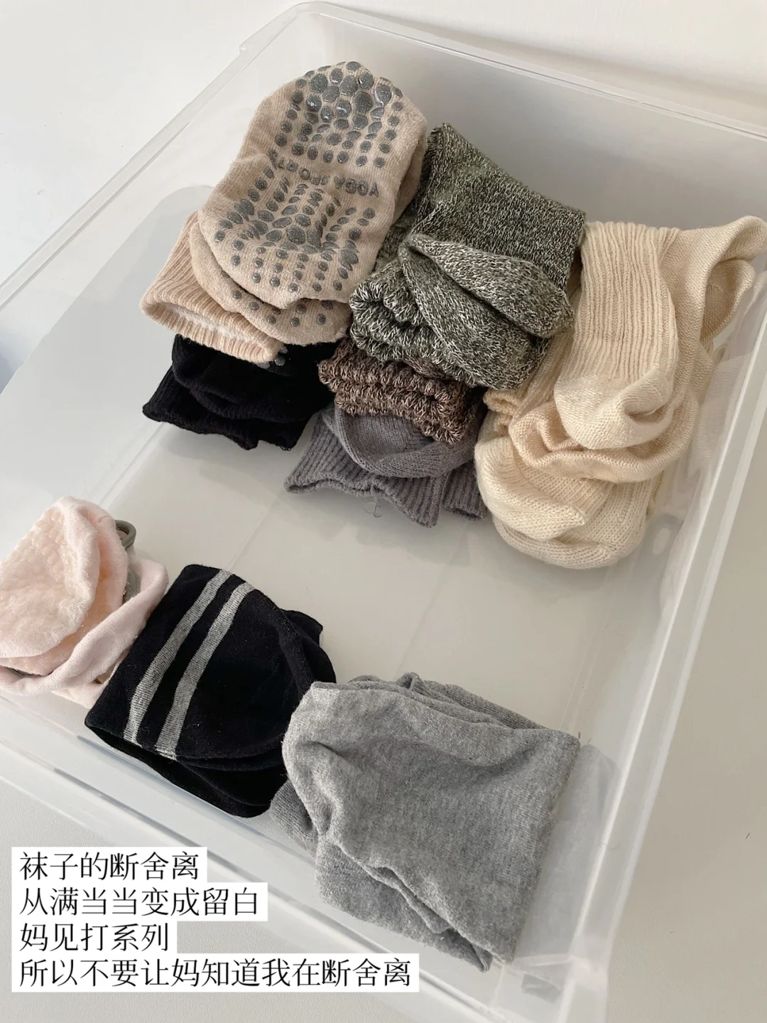 袜子方面,我断舍离了21双袜子,剩下12双袜子(包含3双瑜伽袜),冬季6双,夏季3双,还有8双新袜子。冬季比较适合穿棉袜,留下质量好的保暖棉袜。夏季我现在不太穿袜子,都是凉鞋出门,那就把袜子留在春秋穿,或者一些场合时穿。