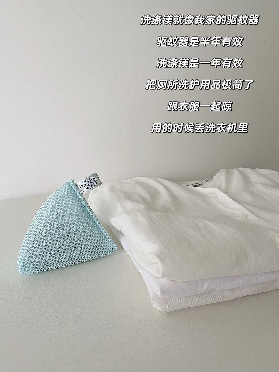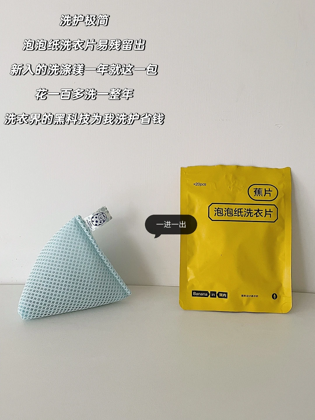 之前用蕉片洗衣片一小片不占地儿,但清洗容易残留。新入的洗涤镁,无香能很好去污,这一包能洗一整年,不会使得衣服缩水等破坏衣服的行为,洗完之后跟衣服一起晾挂收纳。