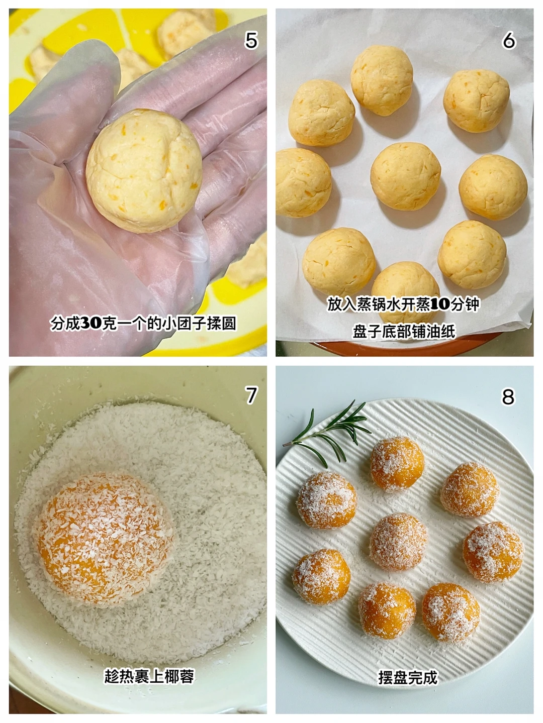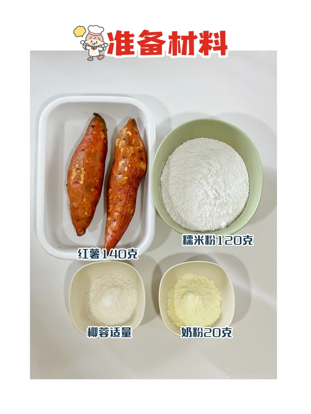 今天做了一款超好吃的小点心——椰蓉红薯糯米糍,不需要烤箱哦,只需要搅一搅,揉一揉,蒸一蒸就可以轻松搞定。 ✅准备材料:红薯140克,糯米粉120克,奶粉20克、椰蓉适量。 ⬇️制作方法:⬇️ 🔹红薯去皮切片,上锅蒸熟,蒸好后趁热碾成泥,放入奶粉和糯米粉,揉成不粘手的饭团. 🔹分成30克一个的小团,揉圆. 🔹放蒸锅水开蒸10分钟(盘子上垫张油纸)蒸好后趁热裹上一层椰蓉就可以啦,太好吃了。 P.S. 红薯的含水量不同,所以糯米粉适量增减,如果太干不成团可以少量多次加入牛奶,揉成团就可以。