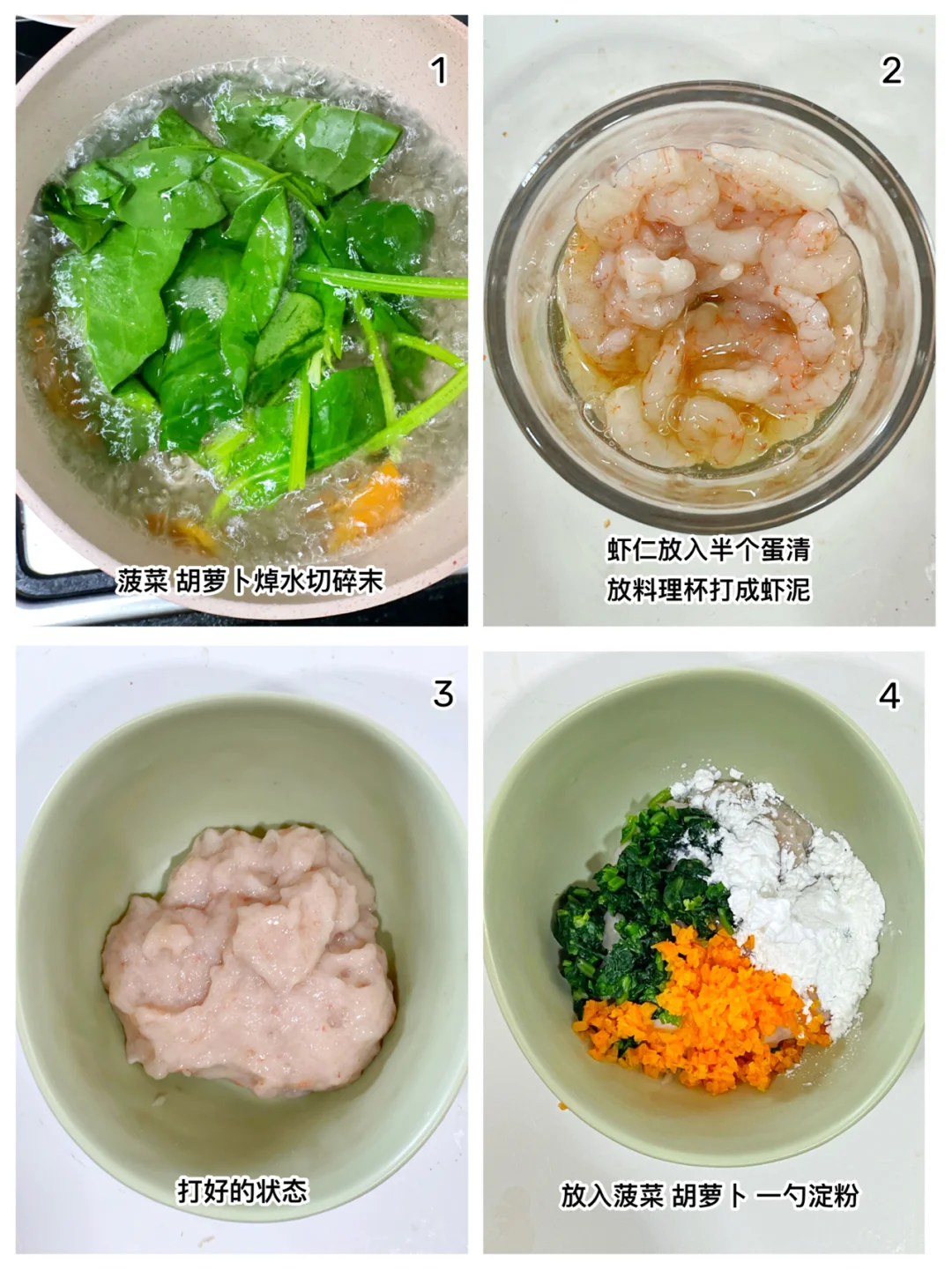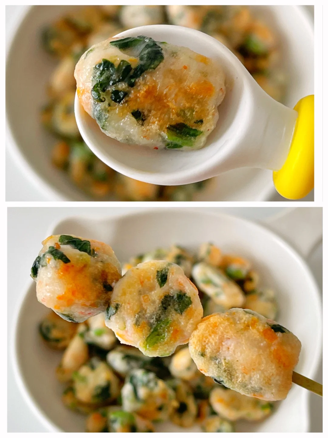 鲜嫩Q弹的鲜虾一口酥,一定要安排,保证宝宝好吃停不下来。一口下去三种食材,营养多多。做法也十分简单,虾仁为主,青菜为辅(青菜可以换成宝宝爱吃的任意青菜),适合10+以上的宝宝。 ✅准备材料:虾仁、菠菜、胡萝卜、核桃油、蛋清、淀粉。 ⬇️制作方法:⬇️ 🔹菠菜、胡萝卜焯水切碎末。 🔹虾仁加一点蛋清放料理杯打成泥, 🔹放入菠菜、胡萝卜和淀粉拌匀,再滴几滴核桃油顺时针搅拌均匀。 🔹装入裱花袋,平底锅刷油,油热后,挤入虾泥,用牙签一次割断,煎至两面金黄熟透即可。 💕无需加盐也一样好吃哦[斜眼R]