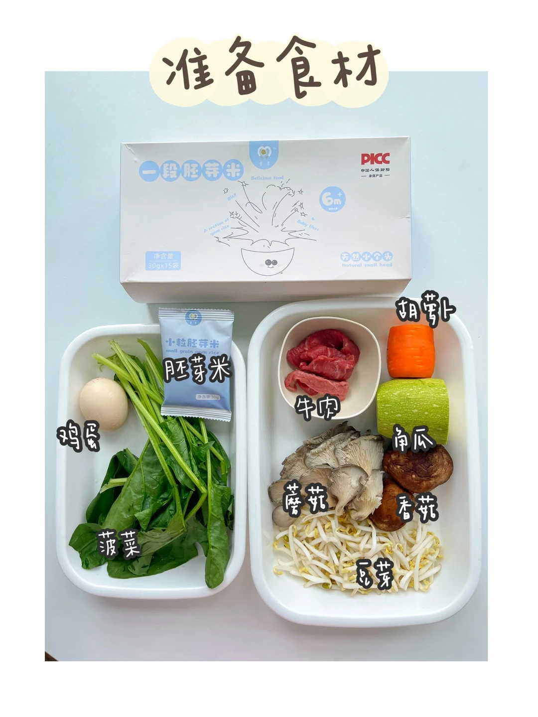 ✅准备食材:牛肉、鸡蛋、胚芽米、菠菜、胡萝卜、角瓜、平菇、香菇、豆芽。
