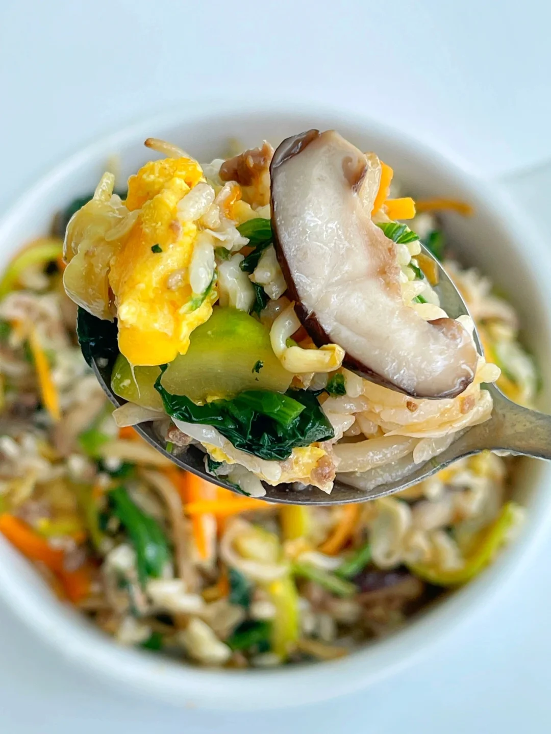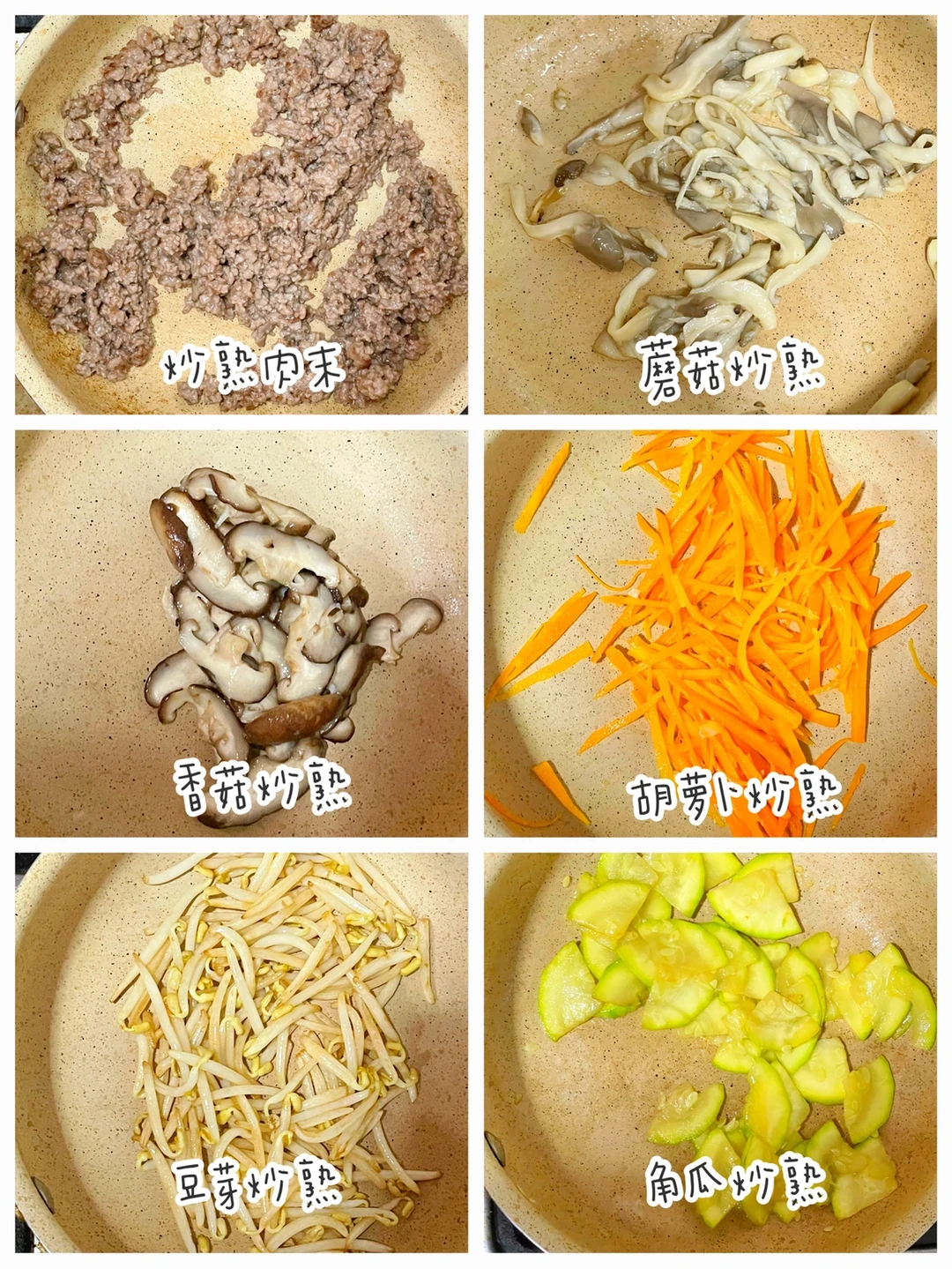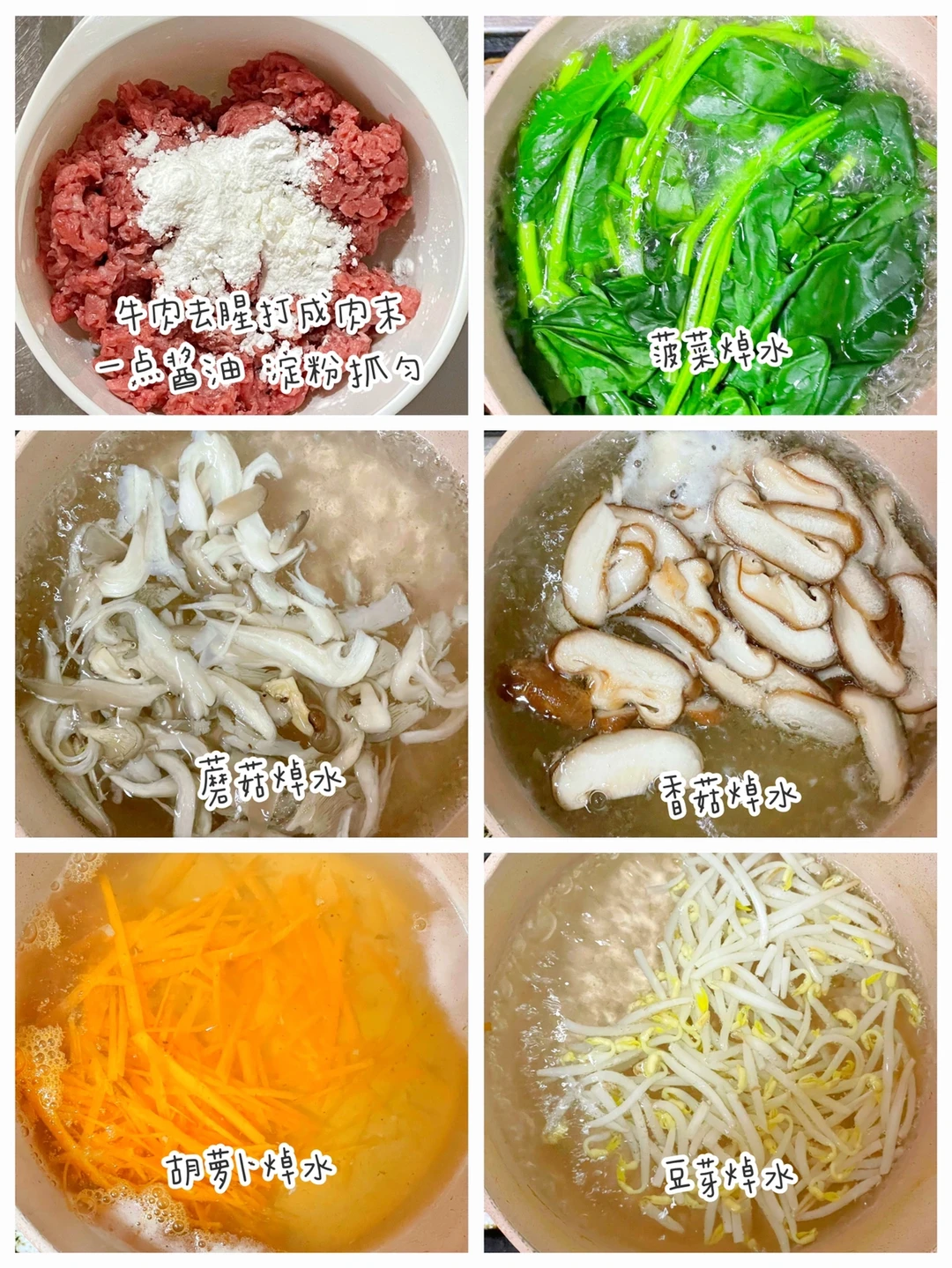 🔹菠菜、平菇、香菇、胡萝卜、豆芽分别焯水,各自炒熟备用。
