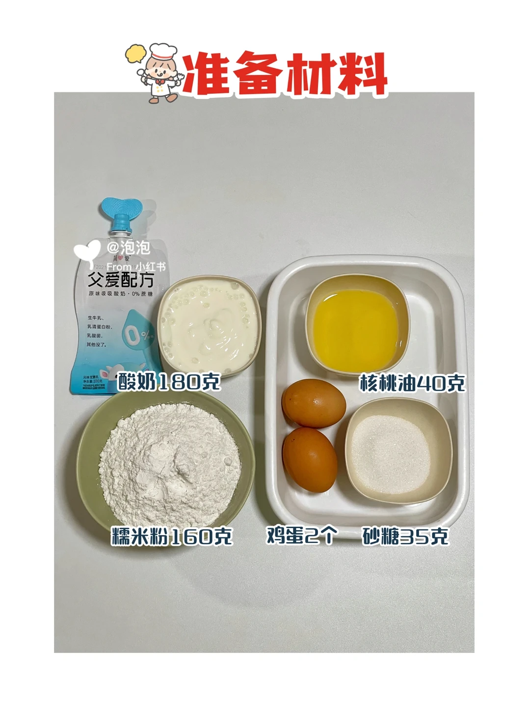 今天分享一款用酸奶做的小糕点——酸奶糯米糕,软软糯糯,一口接一口好吃停不下来,承包了全家人的下午茶[斜眼R] ✅准备食材:酸奶180克,糯米粉160克、核桃油40克、鸡蛋2个、糖35克。 ⬇️制作方法⬇️ 🔹盘中打入鸡蛋、糖、核桃油搅匀,再挤入酸奶(酸奶用的我家两小只超喜欢喝的简❤️酸奶) 🔹倒入低筋面粉搅拌均匀,倒入蛋糕杯模具 🔹放入预热好的烤箱,190度30分钟就可以啦。 ⚠️核桃油也可换玉米油。