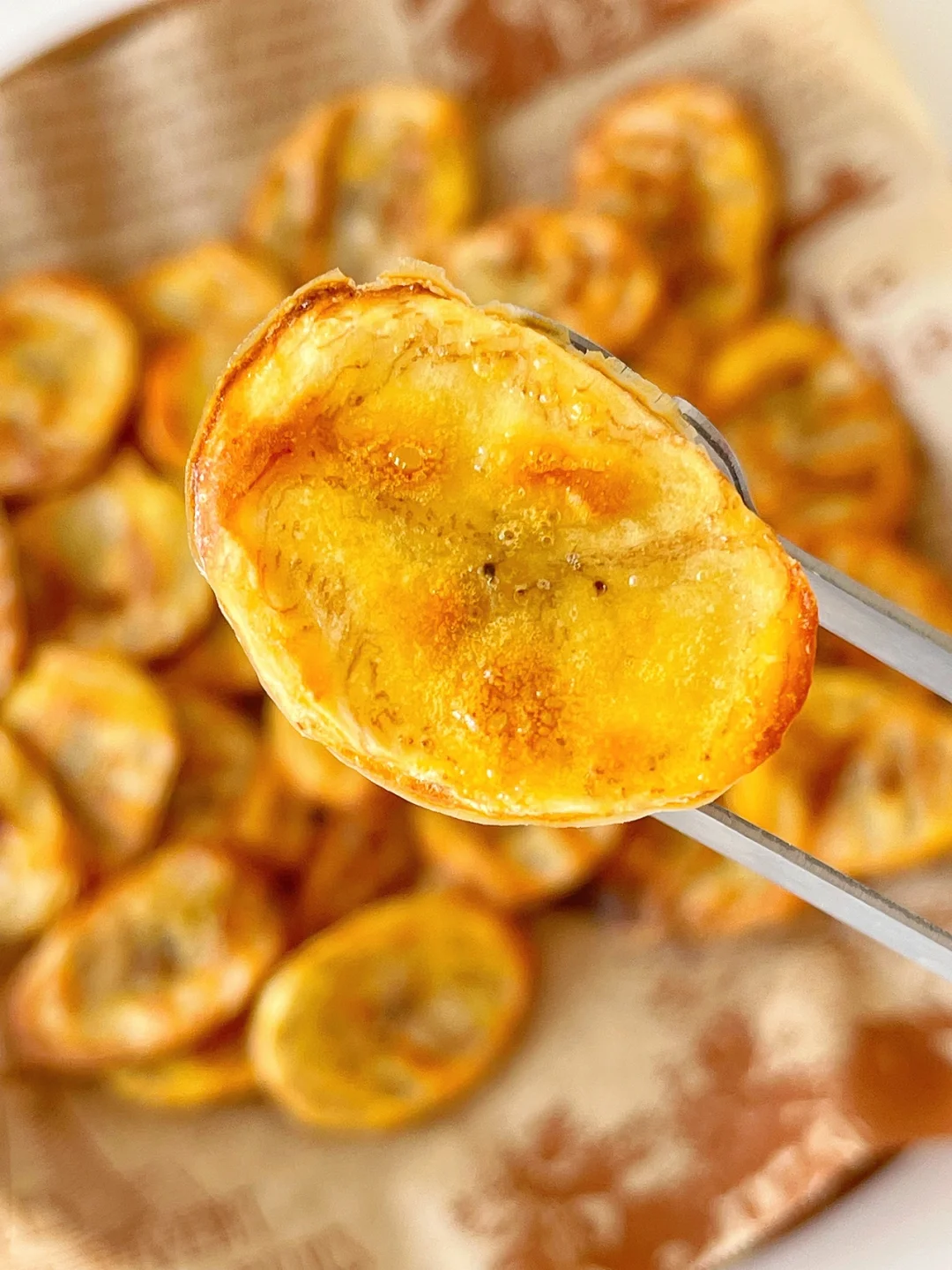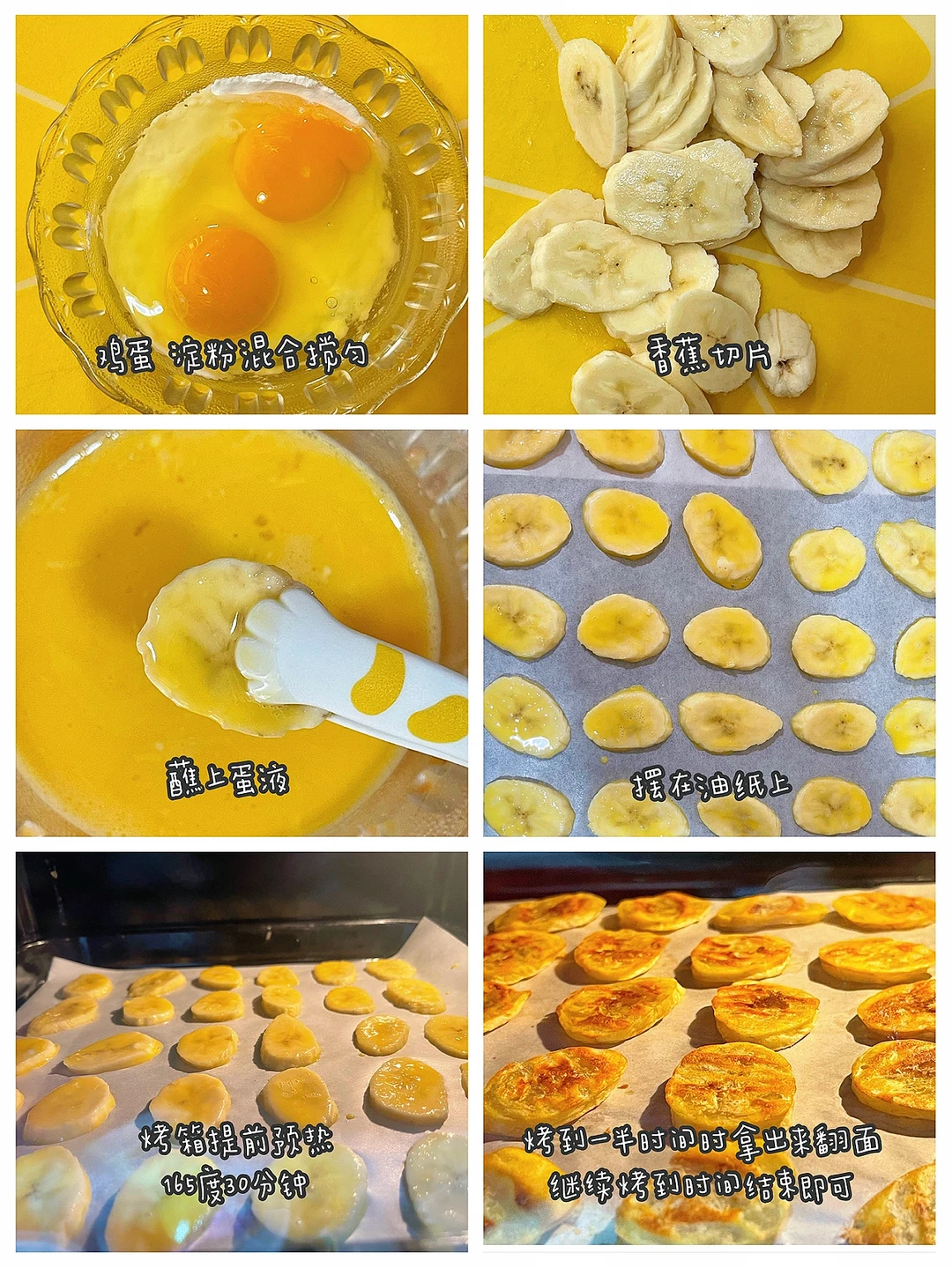 香蕉怎么做都好吃,今天用它做了一款宝宝小零食,烤香蕉片,做法简单0失败哦,烤了2根香蕉根本不够吃[偷笑R] ✅准备食材:香蕉2根、淀粉20克、鸡蛋2个(烤了2根,蛋液还剩一些,建议先用一个鸡蛋+10克淀粉调糊,不够的话再加调[斜眼R]) ⬇️制作方法:⬇️ 🔹鸡蛋+淀粉混合调匀 🔹香蕉切片,蘸取蛋液,依次摆在铺上油纸的烤盘上 🔹烤箱提前预热,165度30分钟.(烤15分钟时候拿出来翻面再继续烤) 今天的美味分享结束啦,下期见哦💕