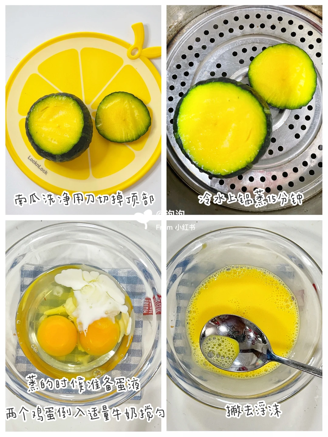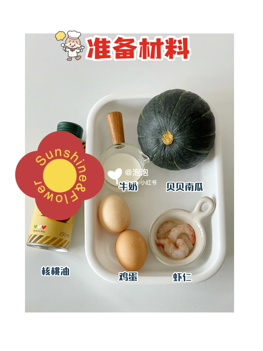 ✅准备材料:贝贝南瓜、鸡蛋2个、牛奶适量(可用配方奶)虾仁适量、核桃油。