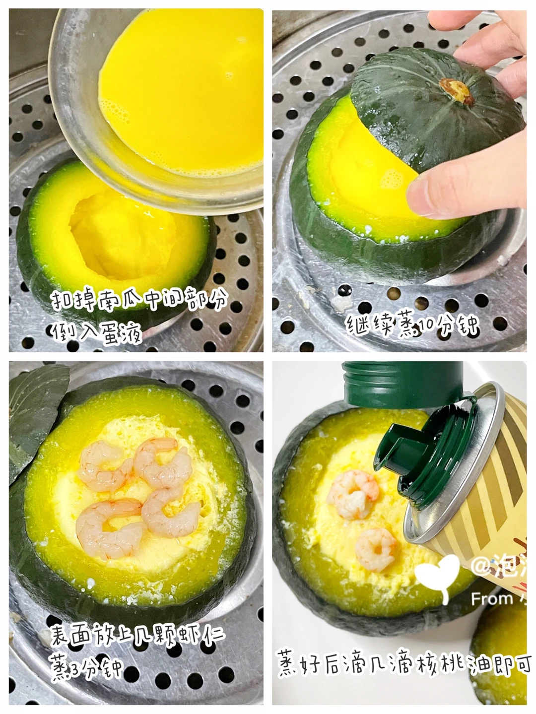 🔹蒸好后去掉南瓜中间部分,中间倒入蛋液,继续蒸10分钟,再放入几颗虾仁,继续蒸3分钟就可以了,给宝宝吃时可以滴几滴核桃油营养加分哦[斜眼R]